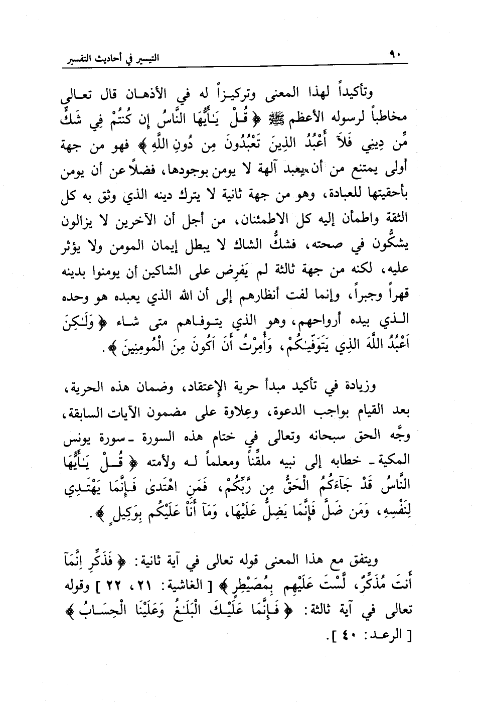 ويتفق مع هذا قوله تعالى في آية ثانية: {فَذَكِّرْ إِنَّمَا أَنْتَ مُذَكِّرٌ * لَسْتَ عَلَيْهِمْ بِمُصَيْطِرٍ} [الغاشية: 21، 22] وقوله تعالى في آية ثالثة: {فَإِنَّمَا عَلَيْكَ الْبَلَاغُ وَعَلَيْنَا الْحِسَابُ} [الرعد: 40].