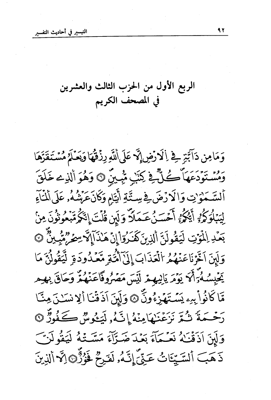 وَمَا مِنْ دَابَّةٍ فِي الْأَرْضِ إِلَّا عَلَى اللَّهِ رِزْقُهَا وَيَعْلَمُ مُسْتَقَرَّهَا وَمُسْتَوْدَعَهَا كُلٌّ فِي كِتَابٍ مُبِينٍ (6) وَهُوَ الَّذِي خَلَقَ السَّمَاوَاتِ وَالْأَرْضَ فِي سِتَّةِ أَيَّامٍ وَكَانَ عَرْشُهُ عَلَى الْمَاءِ لِيَبْلُوَكُمْ أَيُّكُمْ أَحْسَنُ عَمَلًا وَلَئِنْ قُلْتَ إِنَّكُمْ مَبْعُوثُونَ مِنْ بَعْدِ الْمَوْتِ لَيَقُولَنَّ الَّذِينَ كَفَرُوا إِنْ هَذَا إِلَّا سِحْرٌ مُبِينٌ (7) وَلَئِنْ أَخَّرْنَا عَنْهُمُ الْعَذَابَ إِلَى أُمَّةٍ مَعْدُودَةٍ لَيَقُولُنَّ مَا يَحْبِسُهُ أَلَا يَوْمَ يَأْتِيهِمْ لَيْسَ مَصْرُوفًا عَنْهُمْ وَحَاقَ بِهِمْ مَا كَانُوا بِهِ يَسْتَهْزِئُونَ (8) وَلَئِنْ أَذَقْنَا الْإِنْسَانَ مِنَّا رَحْمَةً ثُمَّ نَزَعْنَاهَا مِنْهُ إِنَّهُ لَيَئُوسٌ كَفُورٌ (9) وَلَئِنْ أَذَقْنَاهُ نَعْمَاءَ بَعْدَ ضَرَّاءَ مَسَّتْهُ لَيَقُولَنَّ ذَهَبَ السَّيِّئَاتُ عَنِّي إِنَّهُ لَفَرِحٌ فَخُورٌ (10) إِلَّا الَّذِينَ