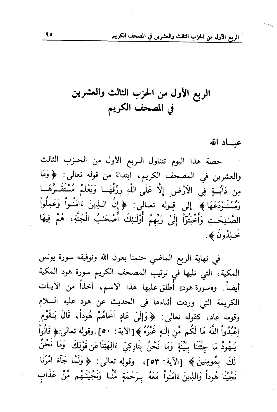 حصة هذا اليوم تتناول الربع الأول من الحزب الثالث والعشرين في المصحف الكريم، ابتداء من قوله تعالى: {وَمَا مِنْ دَابَّةٍ فِي الْأَرْضِ إِلَّا عَلَى اللَّهِ رِزْقُهَا وَيَعْلَمُ مُسْتَقَرَّهَا وَمُسْتَوْدَعَهَا} إلى قوله تعالى: {إِنَّ الَّذِينَ آمَنُوا وَعَمِلُوا الصَّالِحَاتِ وَأَخْبَتُوا إِلَى رَبِّهِمْ أُولَئِكَ أَصْحَابُ الْجَنَّةِ هُمْ فِيهَا خَالِدُونَ}.