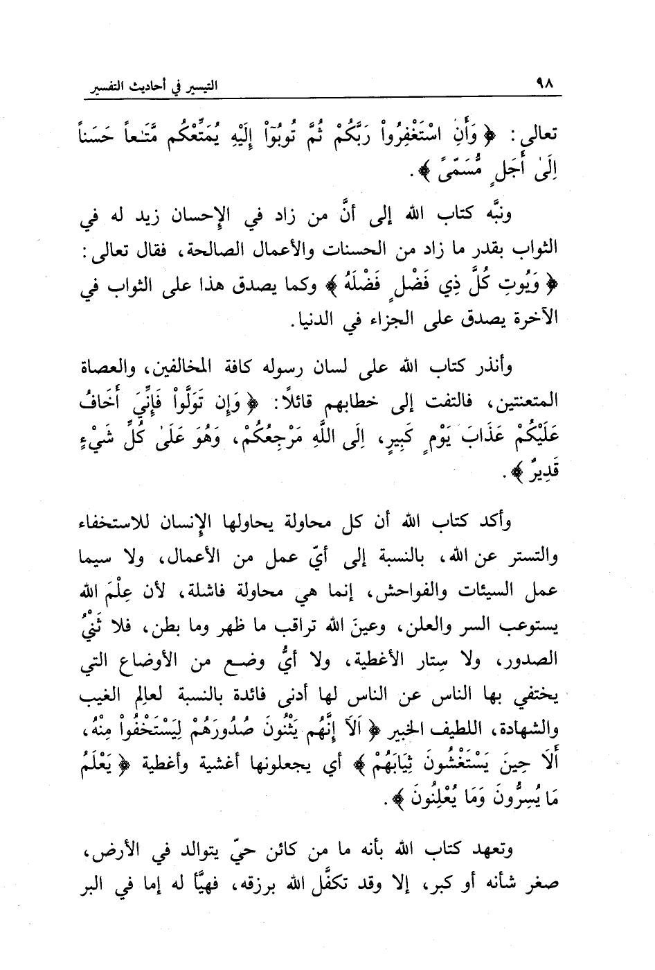 وأكد كتاب الله أن كل محاولة يحاولها الإنسان للاستخفاء والتستر عن الله، بالنسبة إلى أي عمل من الأعمال، ولاسيما عمل السيئات والفواحش، إنما هي محاولة فاشلة، لأن علم الله يستوعب السر والعلن، وعين الله تراقب ما ظهر وما بطن، فلا ثني الصدور، ولا ستار الأغطية، ولا أي وضع من الأوضاع التي يختفي بها الناس لها أدنى فائدة بالنسبة لعالم الغيب والشهادة، اللطيف الخبير {أَلَا إِنَّهُمْ يَثْنُونَ صُدُورَهُمْ لِيَسْتَخْفُوا مِنْهُ أَلَا حِينَ يَسْتَغْشُونَ ثِيَابَهُمْ} أي يجعلونها أغشية وأغطية {يَعْلَمُ مَا يُسِرُّونَ وَمَا يُعْلِنُونَ}.