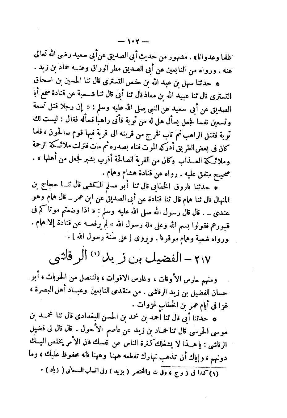 حَدَّثَنَا سَهْلُ بْنُ عَبْدِ اللهِ بْنِ حَفْصٍ التُّسْتَرِيُّ قَالَ: ثنا الْحُسَيْنُ بْنُ إِسْحَاقَ التُّسْتَرِيُّ قَالَ: ثنا عُبَيْدُ اللهِ بْنُ مُعَاذٍ قَالَ: ثنا أَبِي قَالَ: ثنا شُعْبَةُ، عَنْ قَتَادَةَ، سَمِعَ أَبَا الصِّدِّيقِ، عَنْ أَبِي سَعِيدٍ، عَنِ النَّبِيِّ صَلَّى اللهُ عَلَيْهِ وَسَلَّمَ: " §إِنَّ رَجُلًا قَتَلَ تِسْعَةً وَتِسْعِينَ نَفْسًا، فَجَعَلَ يَسْأَلُ هَلْ مِنْ تَوْبَةٍ، فَأَتَى رَاهِبًا فَسَأَلَهُ، فَقَالَ: لَيْسَتْ لَكَ تَوْبَةٌ، فَقَتَلَ الرَّاهِبَ، ثُمَّ تَابَ، فَخَرَجَ مِنْ قَرْيَتِهِ إِلَى قَرْيَةٍ فِيهَا قَوْمٌ صَالِحُونَ، فَلَمَّا كَانَ فِي بَعْضِ الطَّرِيقِ أَدْرَكَهُ الْمَوْتُ، فَنَاءَ بِصَدْرِهِ ثُمَّ مَاتَ، فَنَزَلَتْ مَلَائِكَةُ الرَّحْمَةِ وَمَلَائِكَةُ الْعَذَابِ، وَكَانَ مِنَ الْقَرْيَةِ الصَّالِحَةِ أَقْرَبَ بِشِبْرٍ، فَجُعِلَ مِنْ أَهْلِهَا ". صَحِيحٌ مُتَّفَقٌ عَلَيْهِ رَوَاهُ عَنْ قَتَادَةَ هِشَامٌ وَهَمَّامٌ