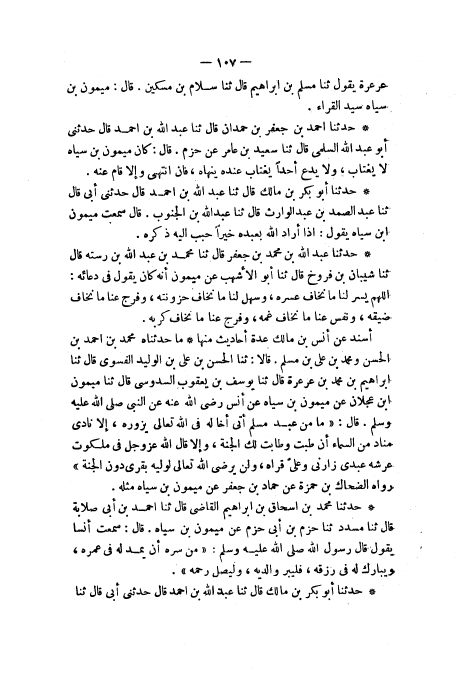 حَدَّثَنَا مُحَمَّدُ بْنُ إِسْحَاقَ بْنِ إِبْرَاهِيمَ الْقَاضِي قَالَ: ثنا أَحْمَدُ بْنُ أَبِي صَلَابَةَ قَالَ: ثنا مُسَدَّدٌ، ثنا حَزْمُ بْنُ أَبِي حَزْمٍ، عَنْ مَيْمُونِ بْنِ سِيَاهٍ قَالَ: سَمِعْتُ أَنَسًا يَقُولُ: قَالَ رَسُولُ اللهِ صَلَّى اللهُ عَلَيْهِ وَسَلَّمَ: «§مَنْ سَرَّهُ أَنْ يُمَدَّ لَهُ فِي عُمْرِهِ، وَيُبَارَكَ لَهُ فِي رِزْقِهِ، فَلْيَبَرَّ وَالِدَيْهِ، وَلْيَصِلْ رَحِمَهُ»