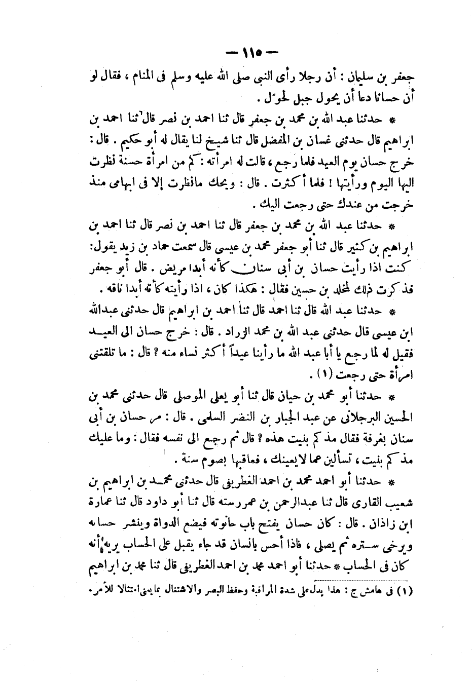 حَدَّثَنَا عَبْدُ اللهِ قَالَ: ثنا أَحْمَدُ قَالَ: ثنا أَحْمَدُ بْنُ إِبْرَاهِيمَ قَالَ: حَدَّثَنِي عَبْدُ اللهِ بْنُ عِيسَى قَالَ: حَدَّثَنِي عَبْدُ اللهِ بْنُ مُحَمَّدٍ الزَّرَّادُ قَالَ: خَرَجَ حَسَّانُ إِلَى الْعِيدِ، فَقِيلَ لَهُ لَمَّا رَجَعَ: يَا أَبَا عَبْدِ اللهِ، §مَا رَأَيْنَا عِيدًا أَكْثَرَ نِسَاءً مِنْهُ، قَالَ: «مَا تَلَقَّتْنِي امْرَأَةٌ حَتَّى رَجَعْتُ»