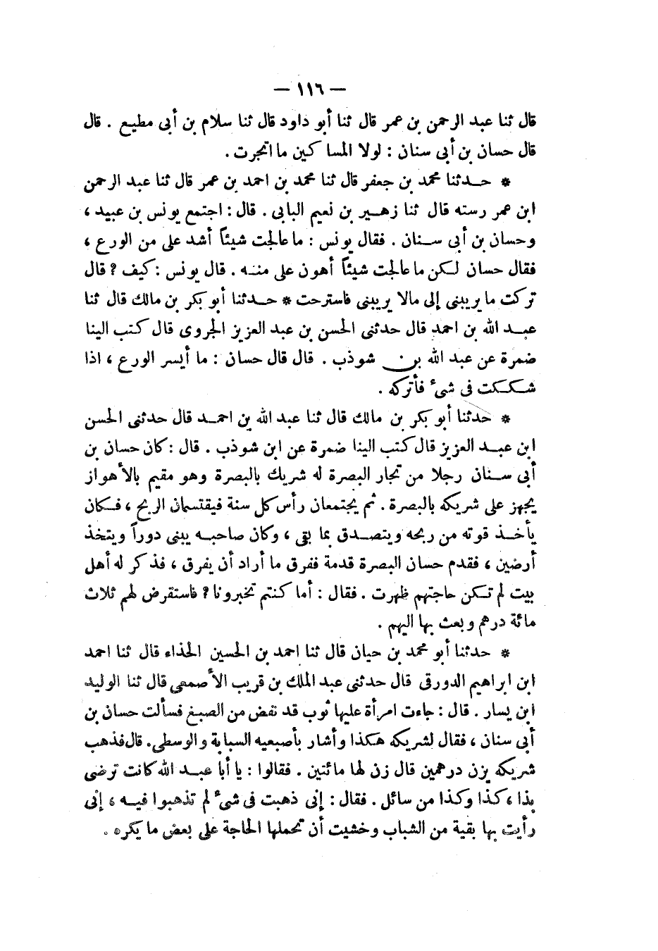 حَدَّثَنَا أَبُو بَكْرِ بْنُ مَالِكٍ قَالَ: ثنا عَبْدُ اللهِ بْنُ أَحْمَدَ قَالَ: حَدَّثَنِي الْحَسَنُ بْنُ عَبْدِ الْعَزِيزِ قَالَ: كَتَبَ إِلَيْنَا ضَمْرَةُ، عَنِ ابْنِ شَوْذَبٍ قَالَ: كَانَ حَسَّانُ بْنُ أَبِي سِنَانٍ رَجُلًا مِنْ تُجَّارِ الْبَصْرَةِ لَهُ شَرِيكٌ بِالْبَصْرَةِ، وَهُوَ مُقِيمٌ بِالْأَهْوَازِ، يُجَهِّزُ عَلَى شَرِيكِهِ بِالْبَصْرَةِ، ثُمَّ يَجْتَمِعَانِ رَأْسَ كُلِّ سَنَةٍ فَيَقْتَسِمَانِ كُلَّ الرِّبْحِ، فَكَانَ يَأْخُذُ قُوتَهُ مِنْ رِبْحِهِ، وَيَتَصَدَّقُ بِمَا بَقِيَ، وَكَانَ صَاحِبُهُ يَبْنِي دُورًا وَيَتَّخِذُ أَرَضِينَ، فَقَدِمَ حَسَّانُ الْبَصْرَةَ قَدْمَةً، فَفَرَّقَ مَا أَرَادَ أَنْ يُفَرِّقَ، فَذُكِرَ لَهُ أَهْلُ بَيْتٍ لَمْ تَكُنْ حَاجَتُهُمْ ظَهَرَتْ، فَقَالَ: §أَمَا كُنْتُمْ تُخْبِرُونَا؟ فَاسْتَقْرَضَ لَهُمْ ثَلَاثَمِائَةِ دِرْهَمٍ وَبَعَثَ بِهَا إِلَيْهِمْ