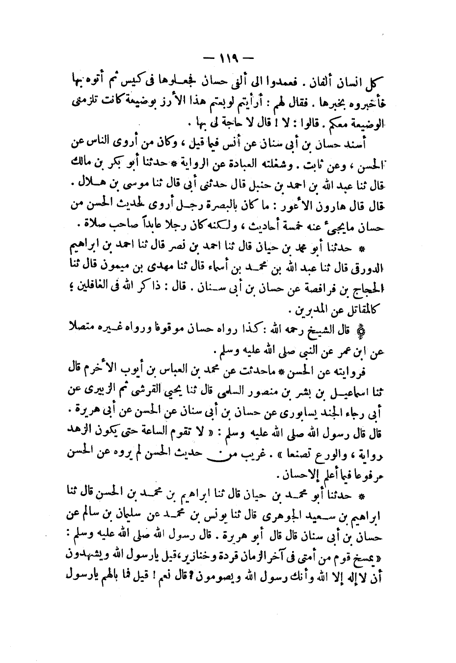 فَرِوَايَتُهُ عَنِ الْحَسَنِ مَا حُدِّثْتُ عَنْ مُحَمَّدِ بْنِ الْعَبَّاسِ بْنِ أَيُّوبَ الْأَخْرَمِ قَالَ: ثنا إِسْمَاعِيلُ بْنُ بِشْرِ بْنِ مَنْصُورٍ السُّلَمِيُّ قَالَ: ثنا يَحْيَى الْقُرَشِيُّ ثُمَّ الزُّبَيْرِيُّ، عَنْ أَبِي رَجَاءٍ الْجُنْدِ نَيْسَابُورِيِّ، عَنْ حَسَّانَ بْنِ أَبِي سِنَانٍ، عَنِ الْحَسَنِ، عَنْ أَبِي هُرَيْرَةَ قَالَ: قَالَ رَسُولُ اللهِ صَلَّى اللهُ عَلَيْهِ وَسَلَّمَ: «§لَا تَقُومُ السَّاعَةُ حَتَّى يَكُونَ الزُّهْدُ رِوَايَةً، وَالْوَرَعُ تَصَنُّعًا». غَرِيبٌ مِنْ حَدِيثِ الْحَسَنِ، لَمْ يَرْوِهِ عَنِ الْحَسَنِ مَرْفُوعًا فِيمَا أَعْلَمُ إِلَّا حَسَّانُ