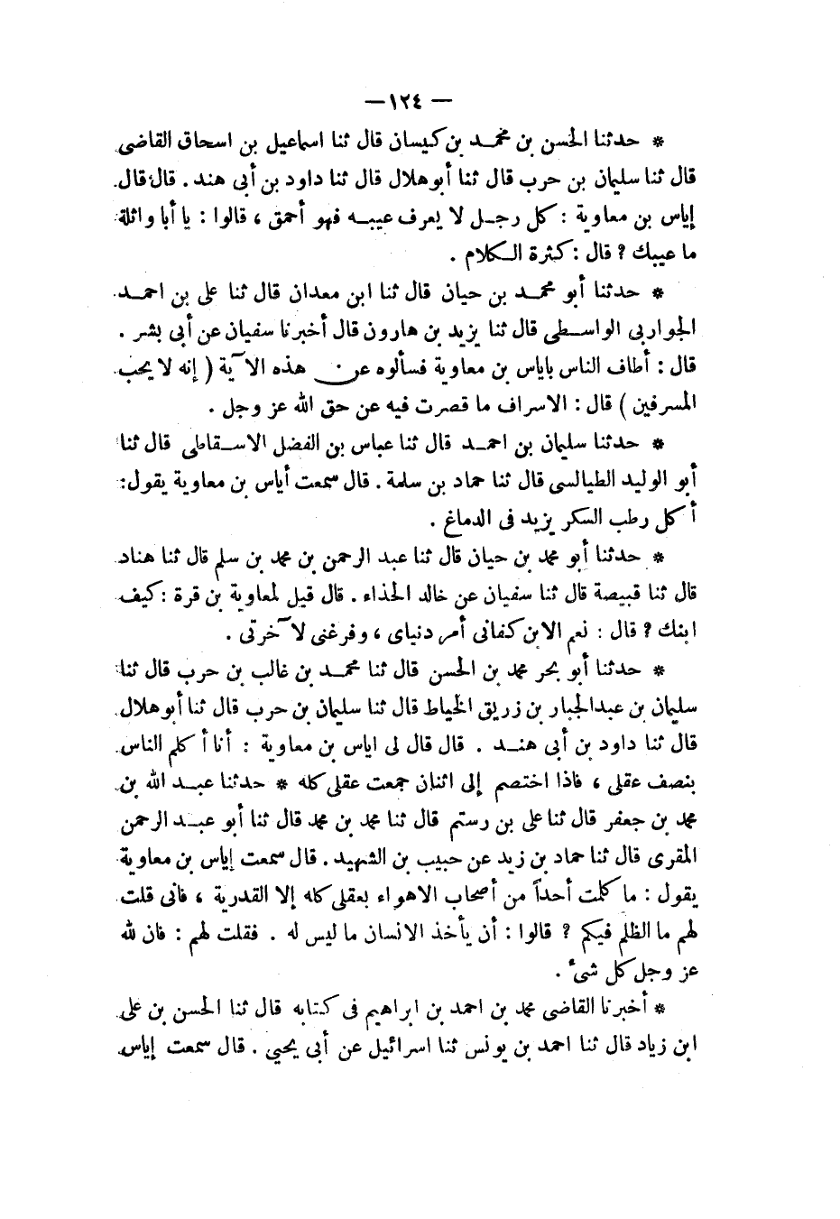 حَدَّثَنَا أَبُو بَحْرٍ مُحَمَّدُ بْنُ الْحَسَنِ قَالَ: ثنا مُحَمَّدُ بْنُ غَالِبِ بْنِ حَرْبٍ قَالَ: ثنا سُلَيْمَانُ بْنُ عَبْدِ الْجَبَّارِ بْنِ زُرَيْقٍ الْخَيَّاطُ قَالَ: ثنا سُلَيْمَانُ بْنُ حَرْبٍ قَالَ: ثنا أَبُو هِلَالٍ قَالَ: ثنا دَاوُدُ بْنُ أَبِي هِنْدٍ قَالَ: قَالَ لِي إِيَاسُ بْنُ مُعَاوِيَةَ: «§أَنَا أُكَلِّمُ النَّاسَ بِنِصْفِ عَقْلِي، فَإِذَا اخْتَصَمَ إِلَيَّ اثْنَانِ جَمَعْتُ عَقْلِي كُلَّهُ»
