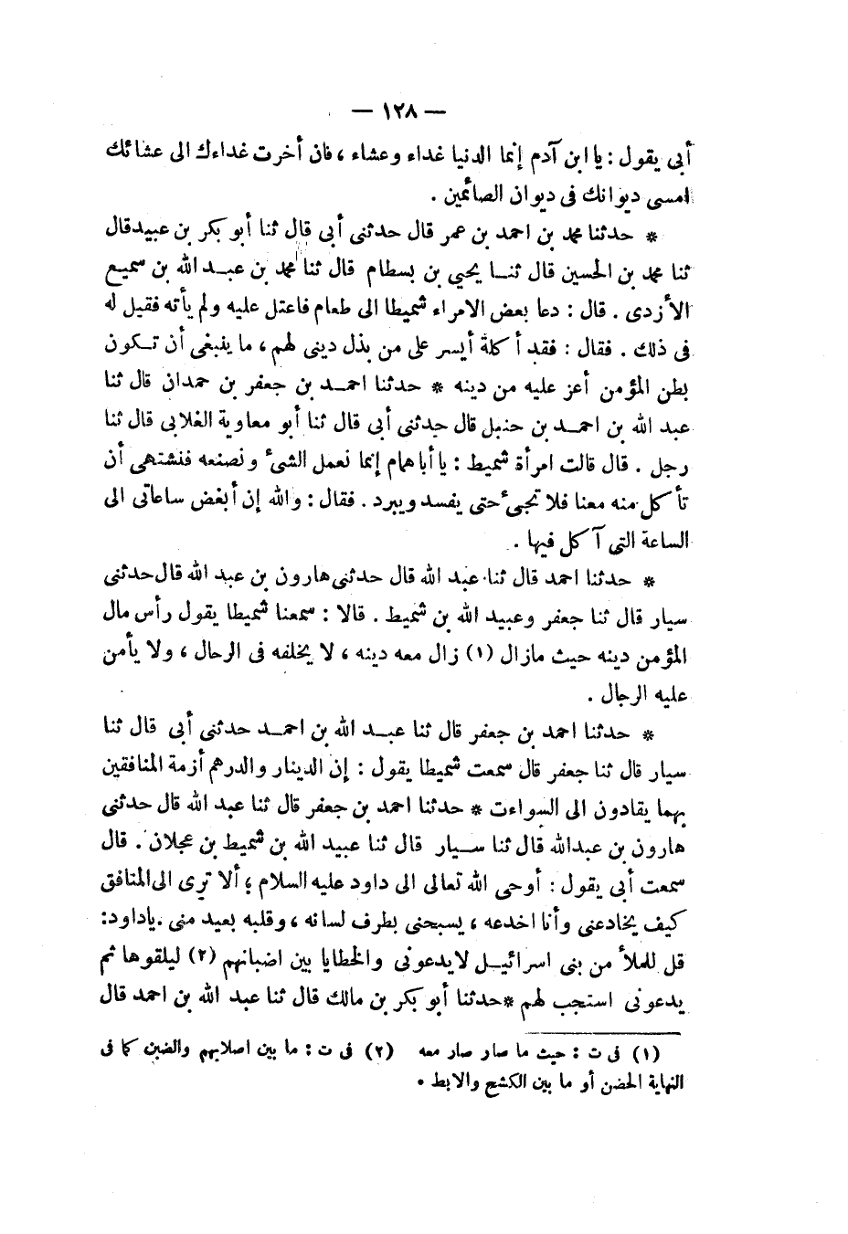 حَدَّثَنَا أَحْمَدُ قَالَ: ثنا عَبْدُ اللهِ قَالَ: حَدَّثَنِي هَارُونُ بْنُ عَبْدِ اللهِ قَالَ: حَدَّثَنِي سَيَّارٌ قَالَ: ثنا جَعْفَرٌ، وَعُبَيْدُ اللهِ بْنُ شُمَيْطٍ، قَالَا: سَمِعْنَا شُمَيْطًا يَقُولُ: «§رَأْسُ مَالِ الْمُؤْمِنِ دِينُهُ، حَيْثُمَا زَالَ زَالَ مَعَهُ دِينُهُ، لَا يُخَلِّفُهُ فِي الرِّحَالِ، وَلَا يَأْمَنُ عَلَيْهِ الرِّجَالَ»