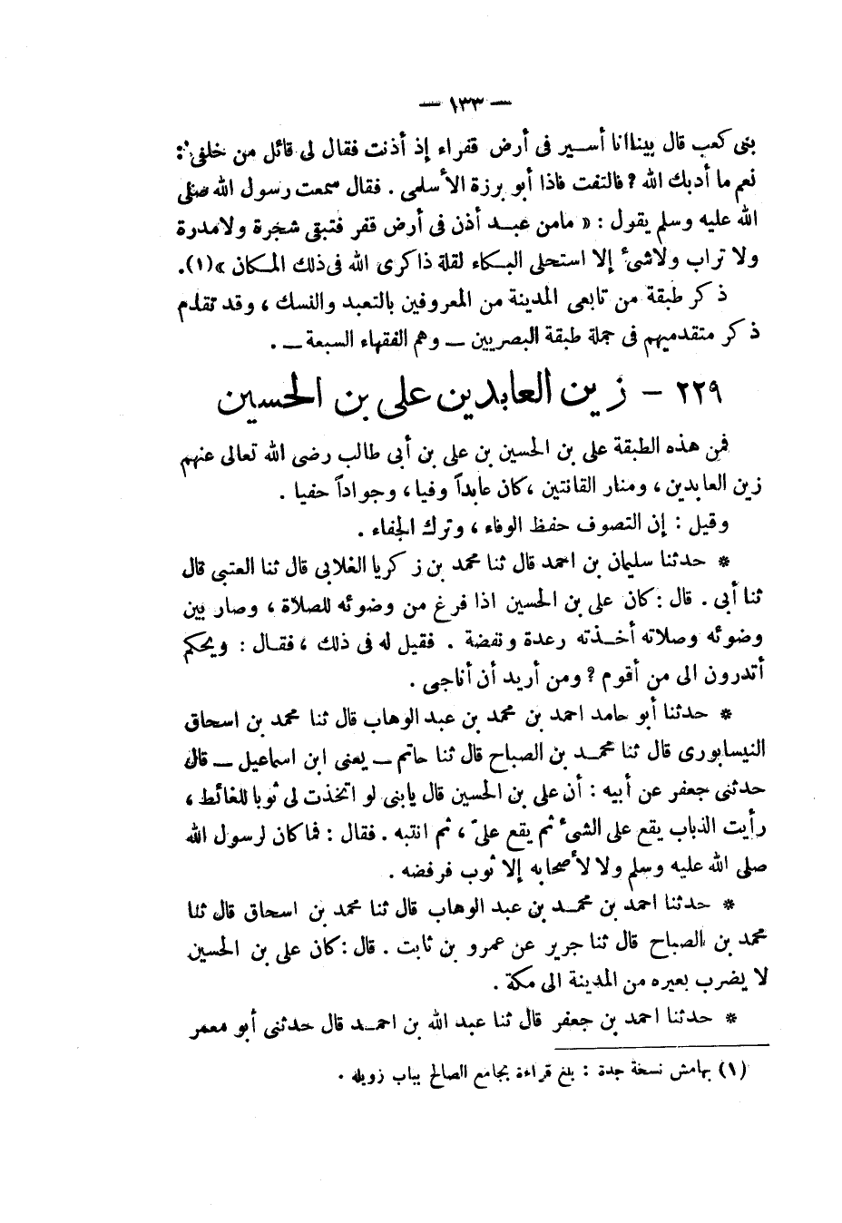 §زَيْنُ الْعَابِدِينَ عَلِيُّ بْنُ الْحُسَيْنِ فَمِنْ هَذِهِ الطَّبَقَةِ عَلِيُّ بْنُ الْحُسَيْنِ بْنِ عَلِيِّ بْنِ أَبِي طَالِبٍ رَضِيَ اللهُ تَعَالَى عَنْهُمْ، زَيْنُ الْعَابِدِينَ، وَمَنَارُ الْقَانِتِينَ، كَانَ عَابِدًا وَفِيًّا، جَوَّادًا حَفِيًّا. وَقِيلَ: إِنَّ التَّصَوُّفَ حِفْظُ الْوَفَاءِ، وَتَرْكُ الْجَفَاءِ.