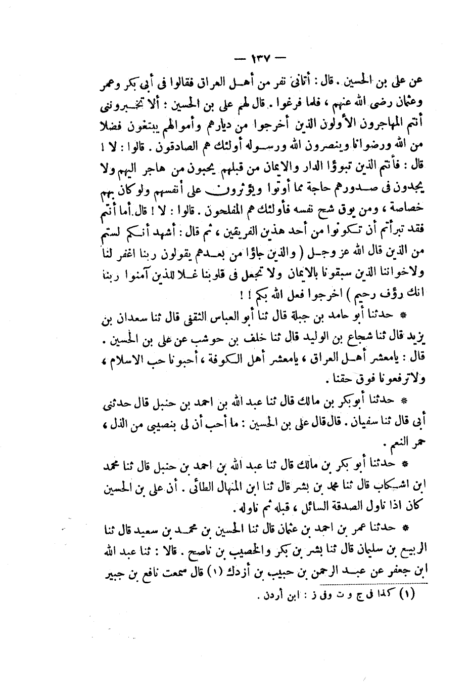 عَنْ عَلِيِّ بْنِ الْحُسَيْنِ، قَالَ: " §أَتَانِي نَفَرٌ مِنْ أَهْلِ الْعِرَاقِ، فَقَالُوا فِي أَبِي بَكْرٍ وَعُمَرَ وَعُثْمَانَ رَضِيَ اللهُ عَنْهُمْ، فَلَمَّا فَرَغُوا، قَالَ لَهُمْ عَلِيُّ بْنُ الْحُسَيْنِ: أَلَا تُخْبِرُونَنِي أَنْتُمُ الْمُهَاجِرُونَ الْأَوَّلُونَ الَّذِينَ أُخْرِجُوا مِنْ دِيَارِهِمْ وَأَمْوَالِهِمْ يَبْتَغُونَ فَضْلًا مِنَ اللهِ وَرِضْوَانًا، وَيَنْصُرُونَ اللهَ وَرَسُولَهُ أُولَئِكَ هُمُ الصَّادِقُونَ؟ قَالُوا: لَا، قَالَ: فَأَنْتُمُ الَّذِينَ تَبَوَّءُوا الدَّارَ وَالْإِيمَانَ مِنْ قَبْلِهِمْ يُحِبُّونَ مَنْ هَاجَرَ إِلَيْهِمْ وَلَا يَجِدُونَ فِي صُدُورِهِمْ حَاجَةً مِمَّا أُوتُوا، وَيؤْثِرُونَ عَلَى أَنْفُسِهِمْ وَلَوْ كَانَ بِهِمْ خَصَاصَةٌ وَمَنْ يُوقَ شُحَّ نَفْسِهِ فَأُولَئِكَ هُمُ الْمُفْلِحُونَ؟ قَالُوا: لَا، قَالَ: أَمَّا أَنْتُمْ فَقَدْ تَبَرَّأْتُمْ أَنْ تَكُونُوا مِنْ أَحَدِ هَذَيْنِ الْفَرِيقَيْنِ، ثُمَّ قَالَ: أَشْهَدُ أَنَّكُمْ لَسْتُمْ مِنَ الَّذِينَ قَالَ اللهُ عَزَّ وَجَلَّ {وَالَّذِينَ جَاءُوا مِنْ بَعْدِهِمْ يَقُولُونَ رَبَّنَا اغْفِرْ لَنَا وَلِإِخْوَانِنَا الَّذِينَ سَبَقُونَا بِالْإِيمَانِ وَلَا تَجْعَلْ فِي قُلُوبِنَا غِلًّا لِلذِينَ آمَنُوا رَبَّنَا إِنَّكَ رَءُوفٌ رَحِيمٌ} اخْرُجُوا فَعَلَ اللهُ بِكُمْ "