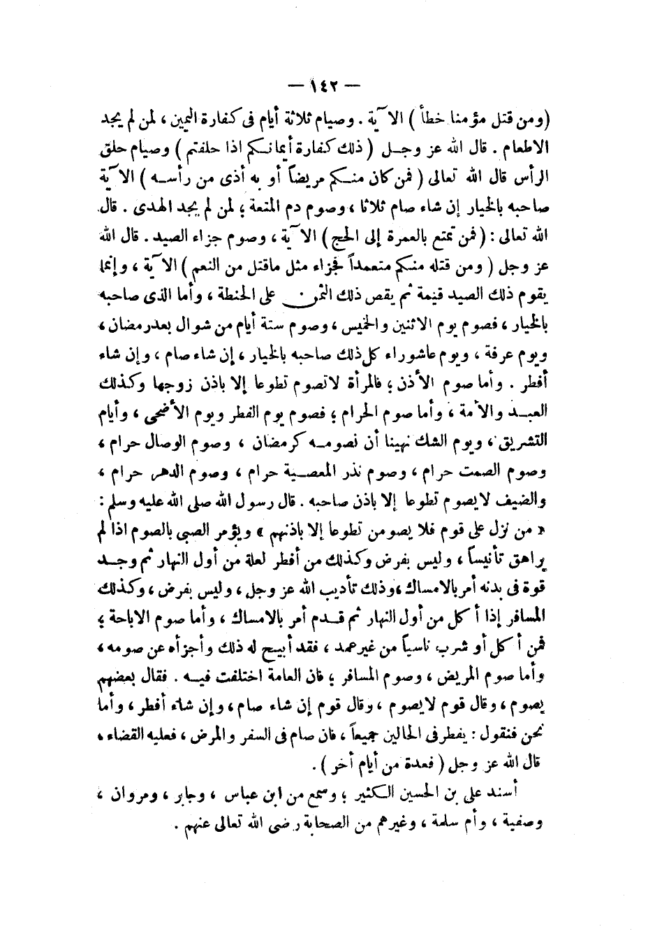 : {وَمَنْ قَتَلَ مُؤْمِنًا خَطَأً} الْآيَةَ، وَصِيَامُ ثَلَاثَةِ أَيَّامٍ فِي كَفَّارَةِ الْيَمِينِ لِمَنْ لَمْ يَجِدِ الْإِطْعَامَ، قَالَ اللهُ عَزَّ وَجَلَّ: {ذَلِكَ كَفَّارَةُ أَيْمَانِكُمْ إِذَا حَلَفْتُمْ} [المائدة: 89] وَصِيَامُ حَلْقِ الرَّأْسِ، قَالَ تَعَالَى: {فَمَنْ كَانَ مِنْكُمْ مَرِيضًا أَوْ بِهِ أَذًى مِنْ رَأْسِهِ} [البقرة: 196] الْآيَةَ، صَاحِبُهُ بِالْخِيَارِ إِنْ شَاءَ صَامَ ثَلَاثًا، وَصِيَامُ دَمِ الْمُتْعَةِ لِمَنْ لَمْ يَجِدِ الْهَدْيَ، قَالَ اللهُ تَعَالَى: {فَمَنْ تَمَتَّعَ بِالْعُمْرَةِ إِلَى الْحَجِّ} [البقرة: 196] الْآيَةَ، وَصَوْمُ جَزَاءِ الصَّيْدِ، قَالَ اللهُ عَزَّ وَجَلَّ: {وَمَنْ قَتَلَهُ مِنْكُمْ مُتَعَمِّدًا فَجَزَاءٌ مِثْلُ مَا قَتَلَ مِنَ النَّعَمِ} [المائدة: 95] الْآيَةَ وَإِنَّمَا يُقَوَّمُ ذَلِكَ الصَّيْدُ قِيمَةً، ثُمَّ يُقَصُّ ذَلِكَ الثَّمَنُ عَلَى الْحِنْطَةِ وَأَمَّا الَّذِي صَاحِبُهُ بِالْخِيَارِ: فَصَوْمُ يَوْمِ الْإِثْنَيْنِ وَالْخَمِيسِ، وَصَوْمُ سِتَّةِ أَيَّامٍ مِنْ شَوَّالٍ بَعْدَ رَمَضَانَ، وَيَوْمِ عَرَفَةَ، وَيَوْمِ عَاشُورَاءَ كُلُّ ذَلِكَ صَاحِبُهُ بِالْخِيَارِ إِنْ شَاءَ صَامَ، وَإِنْ شَاءَ أَفْطَرَ، وَأَمَّا صَوْمُ الْإِذْنِ: فَالْمَرْأَةُ لَا تَصُومُ تَطَوُّعًا إِلَّا بِإِذْنِ زَوْجِهَا، وَكَذَلِكَ الْعَبْدُ وَالْأَمَةُ، وَأَمَّا صَوْمُ الْحَرَامِ: فَصَوْمُ يَوْمِ الْفِطْرِ، وَيَوْمِ الْأَضْحَى، وَأَيَّامِ التَّشْرِيقِ، وَيَوْمِ الشَّكِّ نُهِينَا أَنْ نَصُومَهُ كَرَمَضَانَ - وَصَوْمُ الْوِصَالِ حَرَامٌ، وَصَوْمُ الصَّمْتِ حَرَامٌ، وَصَوْمُ نَذَرِ الْمَعْصِيَةِ حَرَامٌ، وَصَوْمُ الدَّهْرِ حَرَامٌ، وَالضَّيْفُ لَا يَصُومُ إِلَّا بِإِذْنِ صَاحِبِهِ، قَالَ رَسُولُ اللهِ صَلَّى اللهُ عَلَيْهِ وَسَلَّمَ: «§مَنْ نَزَلَ عَلَى قَوْمٍ فَلَا يَصُومَنَّ تَطَوُّعًا إِلَّا بِإِذْنِهِمْ» وَيُؤْمَرُ الصَّبِيُّ بِالصَّوْمِ إِذَا لَمْ يُرَاهِقْ تَأْنِيسًا وَلَيْسَ بِفَرْضٍ، وَكَذَلِكَ مَنْ أَفْطَرَ لِعِلَّةٍ مِنْ أَوَّلِ النَّهَارِ ثُمَّ وَجَدَ قُوَّةً فِي بَدَنِهِ أُمِرَ بِالْإِمْسَاكِ، وَذَلِكَ تَأْدِيبُ اللهِ عَزَّ وَجَلَّ وَلَيْسَ بِفَرْضٍ، وَكَذَلِكَ الْمُسَافِرُ إِذَا أَكَلَ مِنْ أَوَّلَ النَّهَارِ ثُمَّ قَدِمَ أُمِرَ بِالْإِمْسَاكِ، وَأَمَّا صَوْمُ الْإِبَاحَةِ: فَمَنْ أَكَلَ أَوْ شَرِبَ نَاسِيًا مِنْ غَيْرِ عَمْدٍ فَقَدْ أُبِيحَ لَهُ ذَلِكَ، وَأَجْزَأَهُ عَنْ صَوْمِهِ، وَأَمَّا صَوْمُ الْمَرِيضِ وَصَوْمُ الْمُسَافِرِ فَإِنَّ الْعَامَّةَ اخْتَلَفَتْ فِيهِ، فَقَالَ بَعْضُهُمْ: يَصُومُ، وَقَالَ قَوْمٌ: لَا يَصُومُ، وَقَالَ قَوْمٌ: إِنْ شَاءَ صَامَ، وَإِنْ شَاءَ أَفْطَرَ، وَأَمَّا نَحْنُ فَنَقُولُ: يُفْطِرُ فِي الْحَالَيْنِ جَمِيعًا، فَإِنْ صَامَ فِي السَّفَرِ وَالْمَرَضِ فَعَلَيْهِ الْقَضَاءُ، قَالَ اللهُ عَزَّ وَجَلَّ: {فَعِدَّةٌ مِنْ أَيَّامٍ أُخَرَ} [البقرة: 184] " أَسْنَدَ عَلِيُّ بْنُ الْحُسَيْنِ الْكَثِيرَ وَسَمِعَ مِنَ ابْنِ عَبَّاسٍ، وَجَابِرٍ، وَمَرْوَانَ، وَصَفِيَّةَ، وَأُمِّ سَلَمَةَ وَغَيْرِهِمْ مِنَ الصَّحَابَةِ رَضِيَ اللهُ تَعَالَى عَنْهُمْ
