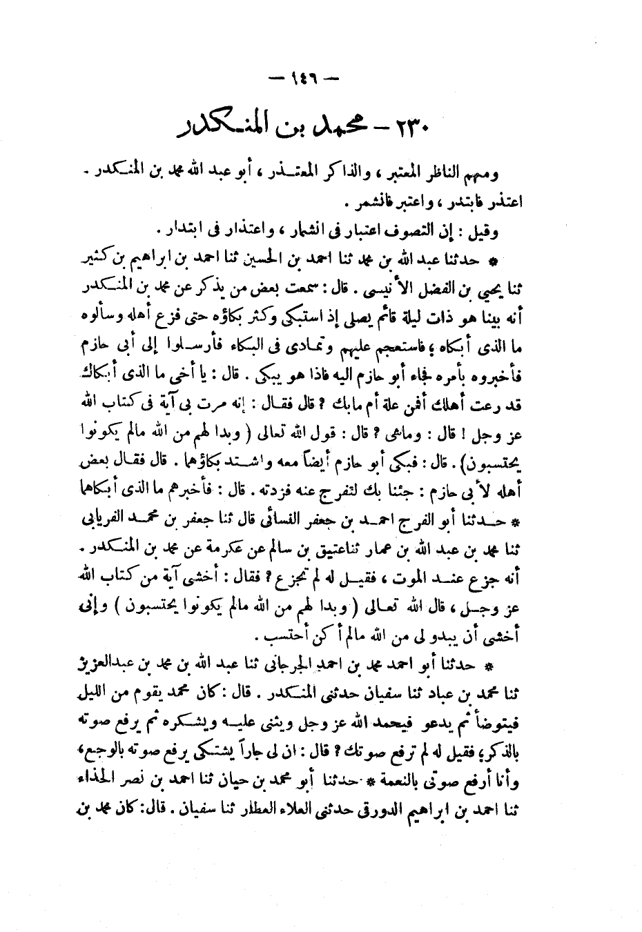 §مُحَمَّدُ بْنُ الْمُنْكَدِرِ وَمِنْهُمُ النَّاظِرُ الْمُعْتَبِرُ، وَالذَّاكِرُ الْمُعْتَذِرُ، أَبُو عَبْدِ اللهِ مُحَمَّدُ بْنُ الْمُنْكَدِرِ، اعْتَذَرَ فَابْتَدَرَ، وَاعْتَبَرَ فَانْشَمَرَ وَقِيلَ: إِنَّ التَّصَوُّفَ اعْتِبَارٌ فِي انْشِمَارٍ، وَاعْتِذَارٌ فِي ابْتِدَارٍ