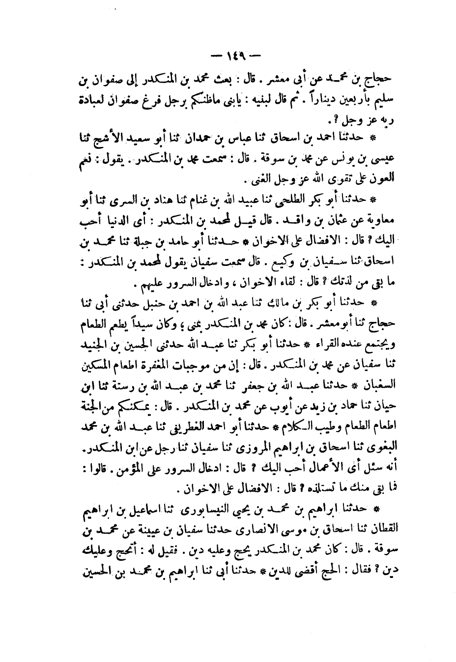 حَدَّثَنَا أَبُو بَكْرٍ الطَّلْحِيُّ، ثَنَا عُبَيْدُ اللهِ بْنُ غَنَّامٍ، ثَنَا هَنَّادُ بْنُ السَّرِيِّ، ثَنَا أَبُو مُعَاوِيَةَ، عَنْ عُثْمَانَ بْنِ وَاقِدٍ، قَالَ: قِيلَ لِمُحَمَّدِ بْنِ الْمُنْكَدِرِ: " §أَيُّ الدُّنْيَا أَحَبُّ إِلَيْكَ؟ قَالَ: الْإِفْضَالُ عَلَى الْإِخْوَانِ "