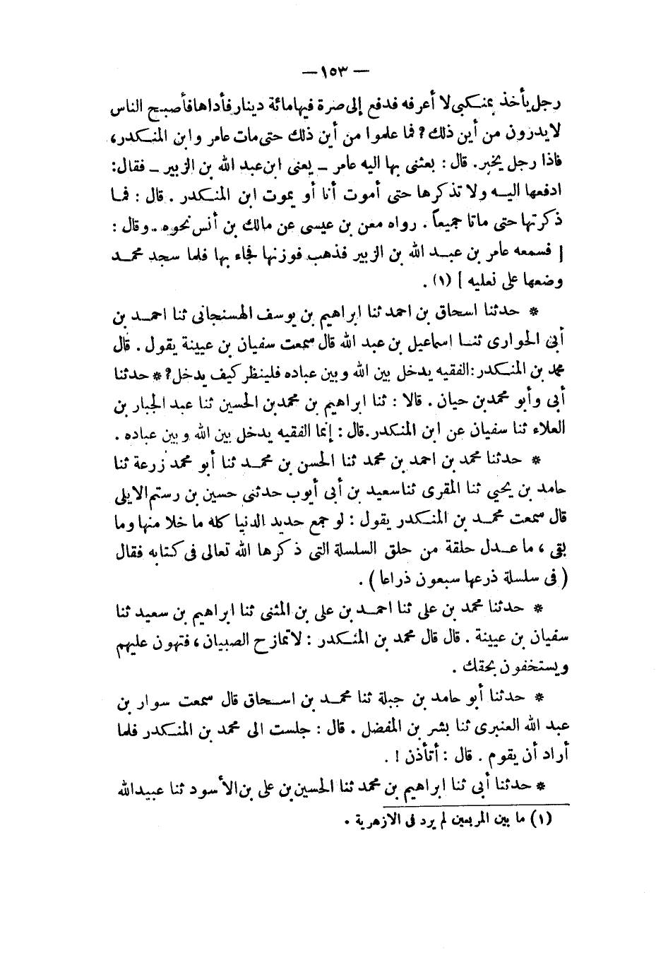 ثَنَا إِسْحَاقُ بْنُ أَحْمَدَ، ثَنَا إِبْرَاهِيمُ بْنُ يُوسُفَ الْهِسِنْجَانِيُّ، ثَنَا أَحْمَدُ بْنُ أَبِي الْحَوَارِيِّ، ثَنَا إِسْمَاعِيلُ بْنُ عَبْدِ اللهِ، قَالَ: سَمِعْتُ سُفْيَانَ بْنَ عُيَيْنَةَ، يَقُولُ: قَالَ مُحَمَّدُ بْنُ الْمُنْكَدِرِ: «§الْفَقِيهُ يَدْخُلُ بَيْنَ اللهِ وَبَيْنَ عِبَادِهِ، فَلْيَنْظُرْ كَيْفَ يَدْخُلُ»