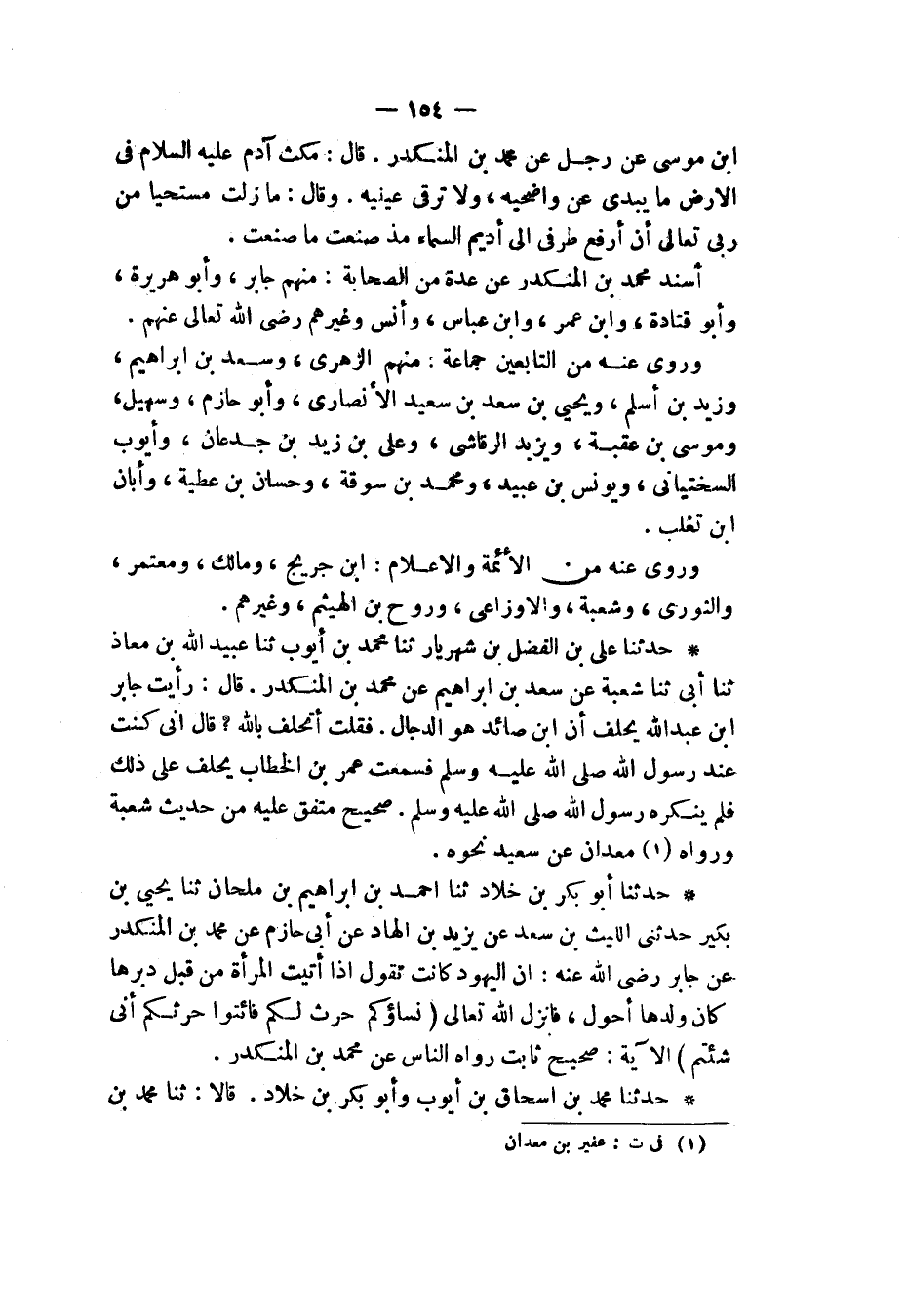 حَدَّثَنَا مُحَمَّدُ بْنُ إِسْحَاقَ بْنِ أَيُّوبَ، وَأَبُو بَكْرِ بْنُ خَلَّادٍ قَالَا: ثَنَا مُحَمَّدُ بْنُ -[155]- عُثْمَانَ بْنِ أَبِي شَيْبَةَ، ثَنَا مِنْجَابٌ، ثَنَا إِبْرَاهِيمُ بْنُ يُوسُفَ، ثَنَا زِيَادُ بْنُ عَبْدِ اللهِ، عَنْ مُحَمَّدِ بْنِ إِسْحَاقَ، حَدَّثَنِي عَمْرُو بْنُ قَيْسٍ، عَنْ مُحَمَّدِ بْنِ الْمُنْكَدِرِ، عَنْ جَابِرِ بْنِ عَبْدِ اللهِ، رَضِيَ اللهُ عَنْهُ قَالَ: " قُتِلَ أَبِي يَوْمَ أُحُدٍ فَبَلَغَنِي ذَلِكَ، فَأَقْبَلْتُ، فَإِذَا هُوَ بَيْنَ يَدَيْ رَسُولِ اللهِ صَلَّى اللهُ عَلَيْهِ وَسَلَّمَ مُسَجًّى، فَتَنَاوَلْتُ الثَّوْبَ عَنْ وَجْهِهِ، وَأَصْحَابُ رَسُولِ اللهِ صَلَّى اللهُ عَلَيْهِ وَسَلَّمَ يَنْهَوْنَنِي كَرَاهِيَةَ أَنْ أَرَى مَا بِهِ مِنَ الْمُثْلَةِ، وَرَسُولُ اللهِ صَلَّى اللهُ عَلَيْهِ وَسَلَّمَ قَاعِدٌ لَا يَنْهَانِي، فَلَمَّا رُفِعَ قَالَ رَسُولُ اللهِ صَلَّى اللهُ عَلَيْهِ وَسَلَّمَ: «§مَا زَالَتِ الْمَلَائِكَةُ حَافَّةً بِأَجْنِحَتِهَا حَتَّى رُفِعَ» ثُمَّ لَقِيَنِي بَعْدَ أَيَّامٍ فَقَالَ: " أَيْ بُنَيَّ أَلَا أُبَشِّرُكَ؟ إِنَّ اللهَ عَزَّ وَجَلَّ أَحْيَا أَبَاكُمْ، فَقَالَ: تَمَنَّهْ، فَقَالَ: أَتَمَنَّى يَا رَبِّ أَنْ تُعِيدَ رُوحِي وَتَرُدَّنِي إِلَى الدُّنْيَا حَتَّى أُقْتَلَ مَرَّةً أُخْرَى، فَقَالَ: إِنِّي قَضَيْتُ أَنَّهُمْ إِلَيْهَا لَا يَرْجِعُونَ " صَحِيحٌ مُتَّفَقٌ عَلَيْهِ رَوَاهُ شُعْبَةُ وَغَيْرُهُ