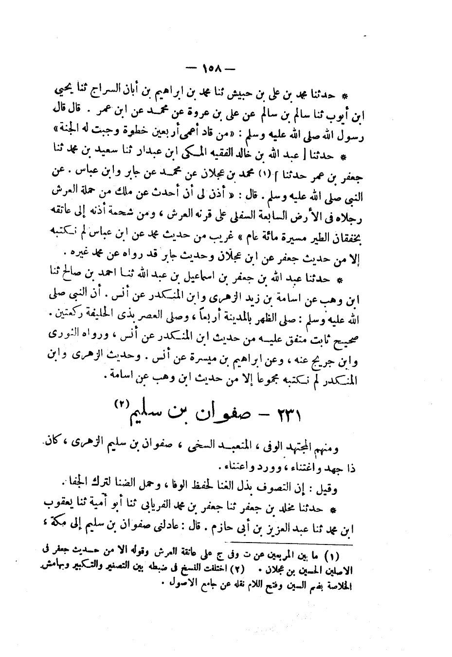 حَدَّثَنَا مَخْلَدُ بْنُ جَعْفَرٍ، ثَنَا جَعْفَرُ بْنُ مُحَمَّدٍ الْفِرْيَابِيُّ، ثَنَا أَبُو أُمَيَّةَ، ثَنَا يَعْقُوبُ بْنُ مُحَمَّدٍ، ثَنَا عَبْدُ الْعَزِيزِ بْنُ أَبِي حَازِمٍ، قَالَ: «§عَادَلَنِي صَفْوَانُ بْنُ سُلَيْمٍ إِلَى مَكَّةَ -[159]- فَمَا وَضَعَ جَنْبَهُ فِي الْمَحْمَلِ حَتَّى رَجَعَ»