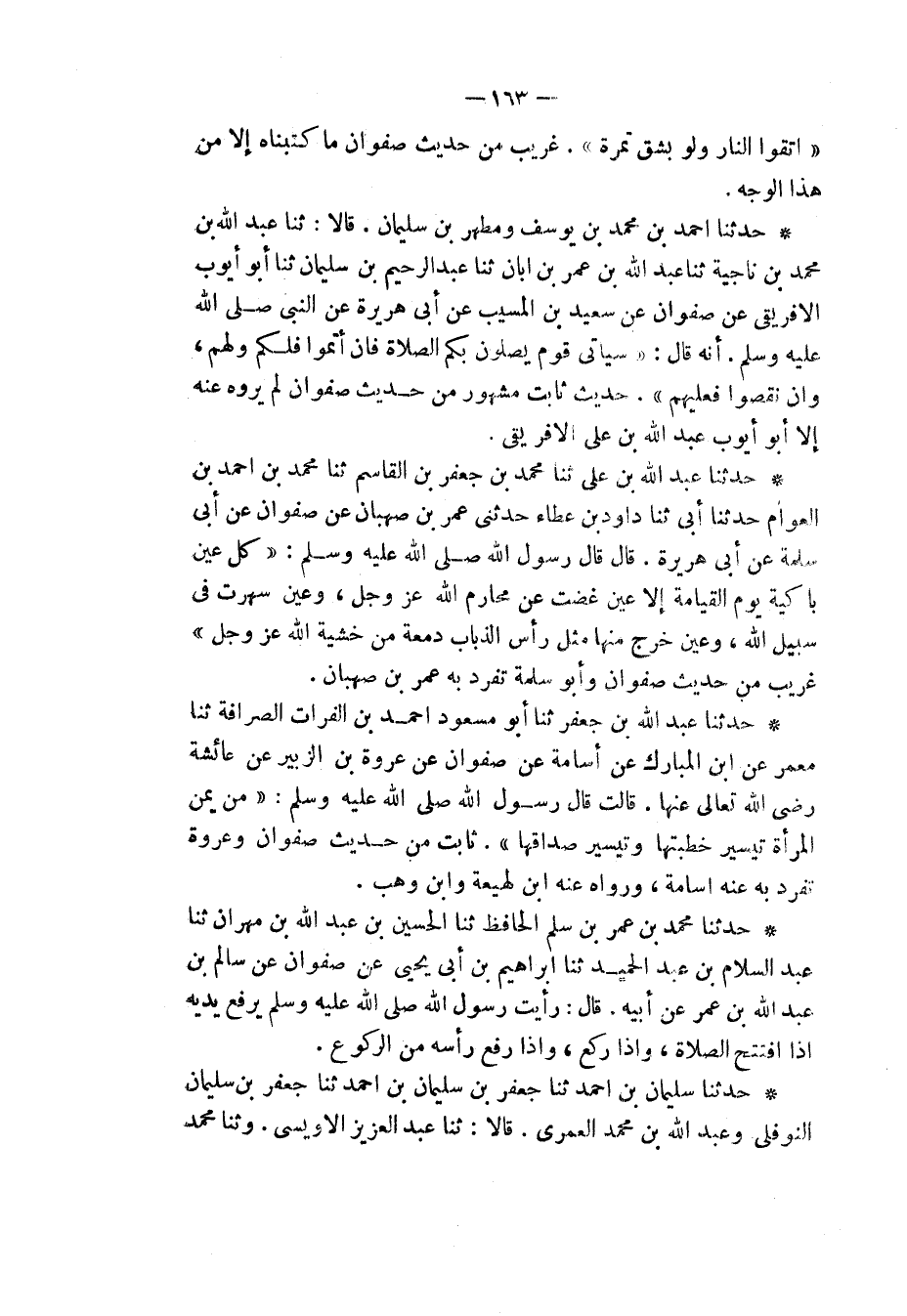 حَدَّثَنَا عَبْدُ اللهِ بْنُ عَلِيٍّ، ثَنَا مُحَمَّدُ بْنُ جَعْفَرِ بْنِ الْقَاسِمِ، ثَنَا مُحَمَّدُ بْنُ أَحْمَدَ بْنِ الْعَوَّامِ، حَدَّثَنَا أَبِي، ثَنَا دَاوُدُ بْنُ عَطَاءٍ، حَدَّثَنِي عُمَرُ بْنُ صُهْبَانَ، عَنْ صَفْوَانَ، عَنْ أَبِي سَلَمَةَ، عَنْ أَبِي هُرَيْرَةَ، قَالَ: قَالَ رَسُولُ اللهِ صَلَّى اللهُ عَلَيْهِ وَسَلَّمَ: «§كُلُّ عَيْنٍ بَاكِيَةٌ يَوْمَ الْقِيَامَةِ إِلَّا عَيْنٌ غَضَّتْ عَنْ مَحَارِمِ اللهِ عَزَّ وَجَلَّ، وَعَيْنٌ سَهِرَتْ فِي سَبِيلِ اللهِ، وَعَيْنٌ خَرَجَ مِنْهَا مِثْلُ رَأْسِ الذُّبَابِ دَمْعَةٌ مِنْ خَشْيَةِ اللهِ عَزَّ وَجَلَّ» غَرِيبٌ مِنْ حَدِيثِ صَفْوَانَ، وَأَبِي سَلَمَةَ، تَفَرَّدَ بِهِ عُمَرُ بْنُ صُهْبَانَ