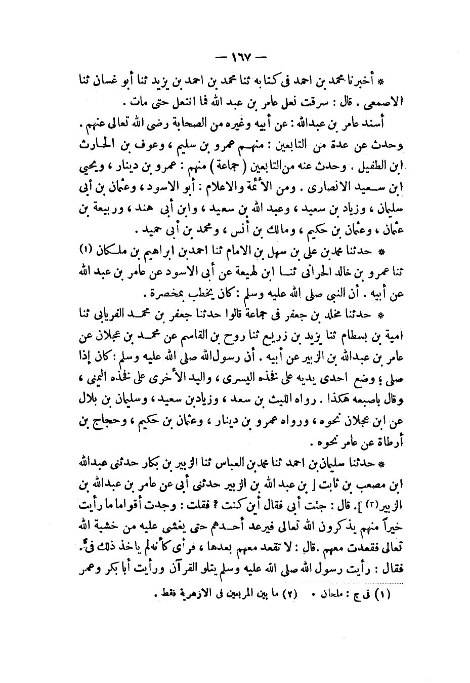 أَخْبَرَنَا مُحَمَّدُ بْنُ أَحْمَدَ فِي كِتَابِهِ، ثَنَا مُحَمَّدُ بْنُ أَحْمَدَ بْنِ يَزِيدَ، ثَنَا أَبُو غَسَّانَ، ثَنَا الْأَصْمَعِيُّ، قَالَ: «§سُرِقَتْ نَعْلُ عَامِرِ بْنِ عَبْدِ اللهِ فَمَا انْتَعَلَ حَتَّى مَاتَ» أَسْنَدَ عَامِرُ بْنُ عَبْدِ اللهِ عَنْ أَبِيهِ وَغَيْرِهِ مِنَ الصَّحَابَةِ رَضِيَ اللهُ تَعَالَى عَنْهُمْ، وَحَدَّثَ عَنْ عِدَّةٍ مِنَ التَّابِعِينَ مِنْهُمْ: عَمْرُو بْنُ سُلَيْمٍ، وَعَوْفُ بْنُ الْحَارِثِ بْنِ الطُّفَيْلِ، وَحَدَّثَ عَنْهُ مِنَ التَّابِعِينَ جَمَاعَةٌ مِنْهُمْ: عَمْرُو بْنُ دِينَارٍ وَيَحْيَى بْنُ سَعِيدٍ الْأَنْصَارِيُّ، وَمِنَ الْأَئِمَّةِ وَالْأَعْلَامِ: أَبُو الْأَسْوَدِ، وَعُثْمَانُ بْنُ أَبِي سُلَيْمَانَ، وَزِيَادُ بْنُ سَعِيدٍ، وَعَبْدُ اللهِ بْنُ سَعِيدٍ، وَابْنُ أَبِي هِنْدٍ، وَرَبِيعَةُ بْنُ عُثْمَانَ، وَعُثْمَانُ بْنُ حَكِيمٍ، وَمَالِكُ بْنُ أَنَسٍ، وَمُحَمَّدُ بْنُ أَبِي حُمَيْدٍ