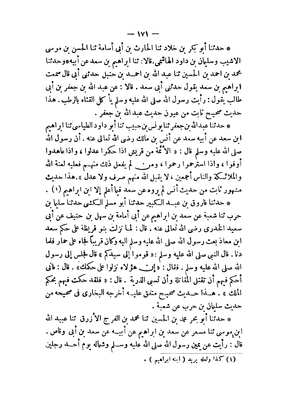 حَدَّثَنَا عَبْدُ اللهِ بْنُ جَعْفَرٍ، ثَنَا يُونُسُ بْنُ حَبِيبٍ، ثَنَا أَبُو دَاوُدَ الطَّيَالِسِيُّ، ثَنَا إِبْرَاهِيمُ بْنُ سَعْدٍ، عَنْ أَبِيهِ، سَعْدٍ، عَنْ أَنَسِ بْنِ مَالِكٍ رَضِيَ اللهُ تَعَالَى عَنْهُ أَنَّ رَسُولَ اللهِ صَلَّى اللهُ عَلَيْهِ وَسَلَّمَ، قَالَ: «§الْأَئِمَّةُ مِنْ قُرَيْشٍ، إِذَا حَكَمُوا عَدَلُوا، وَإِذَا عَاهَدُوا أَوْفَوْا، وَإِذَا اسْتُرْحِمُوا رَحِمُوا، وَمَنْ لَمْ يَفْعَلْ ذَلِكَ مِنْهُمْ فَعَلَيْهِ لَعْنَةُ اللهِ وَالْمَلَائِكَةِ وَالنَّاسِ أَجْمَعِينَ، لَا يَقْبَلُ اللهُ مِنْهُمْ صَرْفًا وَلَا عَدْلًا». هَذَا حَدِيثٌ مَشْهُورٌ ثَابِتٌ مِنْ حَدِيثِ أَنَسٍ لَمْ يَرْوِهِ عَنْ سَعْدٍ، فِيمَا أَعْلَمُ، إِلَّا ابْنُ إِبْرَاهِيمَ