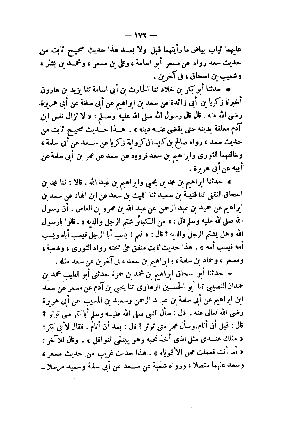 حَدَّثَنَا أَبُو إِسْحَاقَ إِبْرَاهِيمُ بْنُ مُحَمَّدِ بْنِ حَمْزَةَ حَدَّثَنِي أَبُو الطَّيِّبِ مُحَمَّدُ بْنُ حَمْدَانَ النَّصِيبِيُّ ثَنَا أَبُو الْحُسَيْنِ الرَّهَاوِيُّ، ثَنَا يَحْيَى بْنُ آدَمَ، عَنْ مِسْعَرٍ، عَنْ سَعْدِ بْنِ إِبْرَاهِيمَ، عَنْ أَبِي سَلَمَةَ بْنِ عَبْدِ الرَّحْمَنِ، وَسَعِيدُ بْنُ الْمُسَيِّبِ، عَنْ أَبِي هُرَيْرَةَ رَضِيَ اللهُ تَعَالَى عَنْهُ، قَالَ: " سَأَلَ النَّبِيُّ صَلَّى اللهُ عَلَيْهِ وَسَلَّمَ أَبَا بَكْرٍ: «§مَتَى تُوتِرُ؟» قَالَ: قَبْلَ أَنْ أَنَامَ، وَسَأَلَ عُمَرَ: «مَتَى تُوتِرُ؟» قَالَ: بَعْدَ أَنْ أَنَامَ، فَقَالَ لِأَبِي بَكْرٍ: «مِثْلُكَ عِنْدِي مِثْلُ الَّذِي أَخَذَ نَحْبَهُ وَهُوَ يبْتَغِي النَّوَافِلَ» وَقَالَ لِلْآخَرِ: «أَمَّا أَنْتَ فَعَمِلْتَ عَمَلَ الْأَقْوِيَاءِ». هَذَا حَدِيثٌ غَرِيبٌ مِنْ حَدِيثِ مِسْعَرٍ وَسَعْدٍ عَنْهُمَا مُتَّصِلًا وَرَوَاهُ شُعْبَةُ عَنْ سَعْدٍ عَنْ أَبِي سَلَمَةَ وَسَعِيدٍ مُرْسَلًا، -[173]- وَقَدْ رَوَاهُ مُصْعَبُ بْنُ الْمِقْدَامِ عَنْ مِسْعَرٍ، عَنْ سَعْدٍ، عَنْ سَعِيدٍ، عَنِ عَبْدِ الرَّحْمَنِ مُرْسَلًا