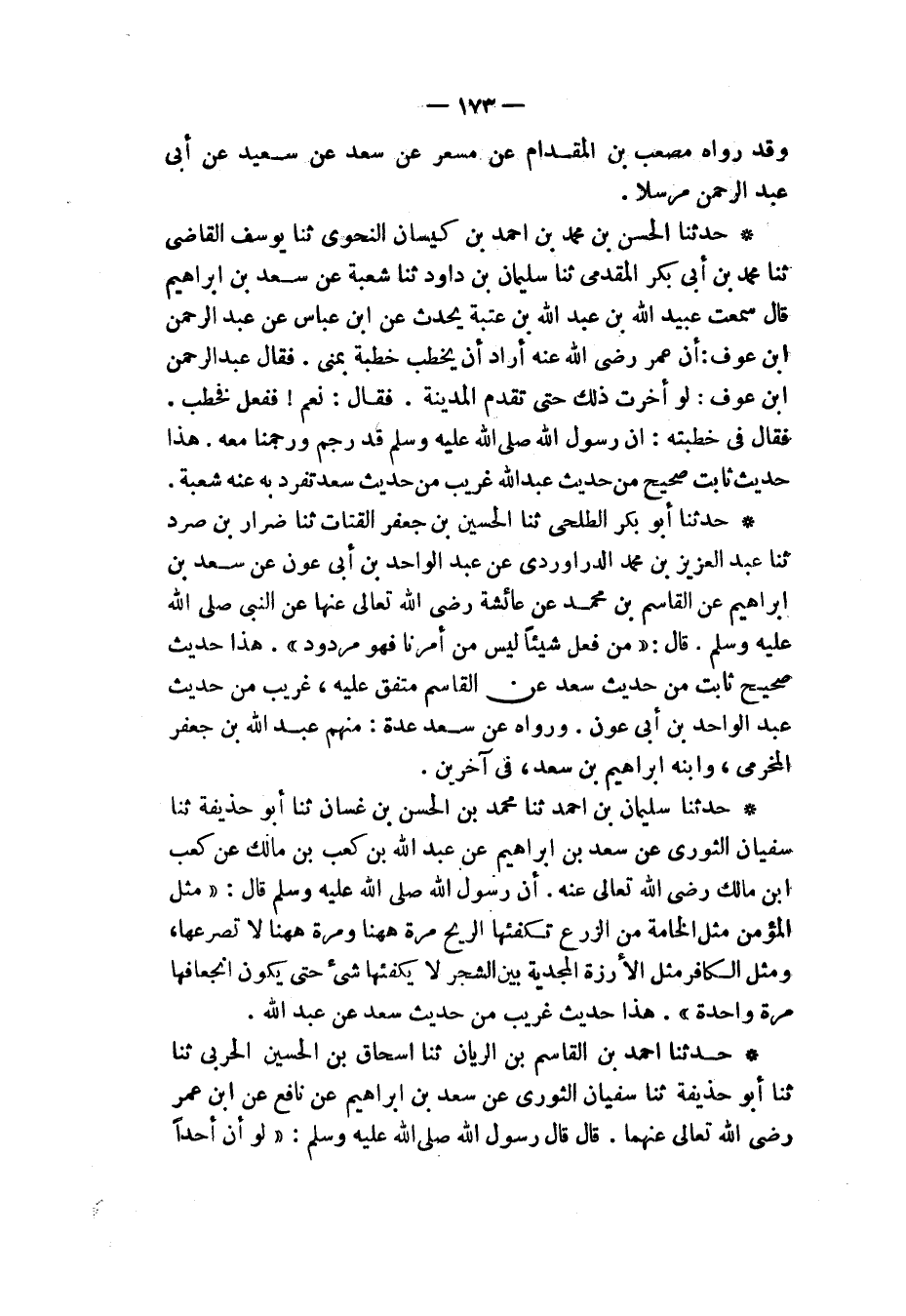 حَدَّثَنَا الْحَسَنُ بْنُ مُحَمَّدِ بْنِ أَحْمَدَ بْنِ كَيْسَانَ النَّحْوِيُّ، ثَنَا يُوسُفُ الْقَاضِي، ثَنَا مُحَمَّدُ بْنُ أَبِي بَكْرٍ الْمُقَدَّمِيُّ، ثَنَا سُلَيْمَانُ بْنُ دَاوُدَ، ثَنَا شُعْبَةُ، عَنْ سَعْدِ بْنِ إِبْرَاهِيمَ قَالَ: سَمِعْتُ عُبَيْدَ اللهِ بْنَ عَبْدِ اللهِ بْنِ عُتْبَةَ يُحَدِّثُ عَنِ ابْنِ عَبَّاسٍ، عَنْ عَبْدِ الرَّحْمَنِ بْنِ عَوْفٍ، أَنَّ عُمَرَ رَضِيَ اللهُ تَعَالَى عَنْهُ: " أَرَادَ أَنْ يَخْطُبَ خُطْبَةً بِمِنًى، فَقَالَ عَبْدُ الرَّحْمَنِ بْنُ عَوْفٍ: لَوْ أَخَّرْتَ ذَلِكَ حَتَّى تَقْدَمَ الْمَدِينَةَ، فَقَالَ: نَعَمْ، فَفَعَلَ فَخَطَبَ، فَقَالَ فِي خُطْبَتِهِ: إِنَّ §رَسُولَ اللهِ صَلَّى اللهُ عَلَيْهِ وَسَلَّمَ قَدْ رَجَمَ وَرَجَمْنَا مَعَهُ ". هَذَا حَدِيثٌ ثَابِتٌ صَحِيحٌ مِنْ حَدِيثِ عَبْدِ اللهِ، غَرِيبٌ مِنْ حَدِيثِ سَعْدٍ، تَفَرَّدَ بِهِ عَنْهُ شُعْبَةُ