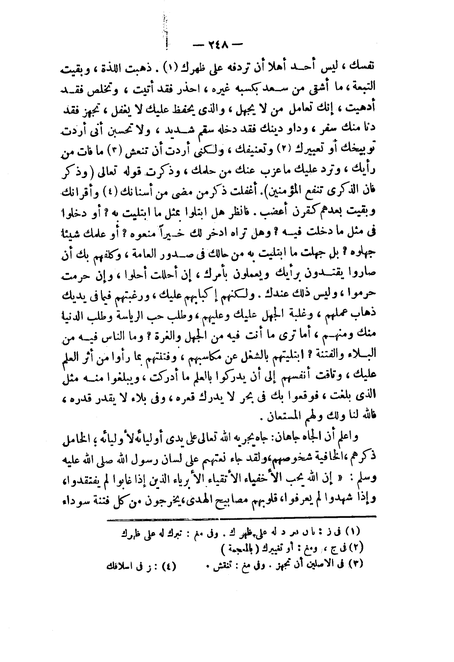 نَفْسِكَ، لَيْسَ أَحَدٌ أَهْلًا أَنْ تُرْدِفَهُ عَلَى ظَهْرِكَ، ذَهَبَتِ اللَّذَّةُ، وَبَقِيَتِ التَّبِعَةُ، مَا أَشْقَى مَنْ سَعِدَ بِكَسْبِهِ غَيْرُهُ، احْذَرْ فَقَدْ أُتِيتَ، وَتَخَلَّصْ فَقَدْ أُدْهِيتَ، إِنَّكَ تُعَامِلُ مَنْ لَا يَجْهَلُ، وَالَّذِي يَحْفَظُ عَلَيْكَ لَا يَغْفُلُ، تَجَهَّزْ فَقَدْ دَنَا مِنْكَ سَفَرٌ، وَدَاوِ دِينَكَ فَقَدْ دَخَلَهُ سَقَمٌ شَدِيدٌ، وَلَا تَحْسَبَنَّ أَنِّي أَرَدْتُ تَوْبِيخَكَ أَوْ تَعْيِيرَكَ وَتَعْنِيفَكَ، وَلَكِنِّي أَرَدْتُ أَنْ تُنْعِشَ مَا فَاتَ مِنْ رَأْيِكَ، وَتَرُدَّ عَلَيْكَ مَا عَزَبَ عَنْكَ مِنْ حِلْمِكَ، وَذَكَرْتُ قَوْلَهُ تَعَالَى {وَذَكِّرْ فَإِنَّ الذِّكْرَى تَنْفَعُ الْمُؤْمِنِينَ} [الذاريات: 55] أَغَفَلْتَ ذِكْرَ مَنْ مَضَى مِنْ أَسْنَانِكَ وَأَقْرَانِكَ، وَبَقِيتَ بَعْدَهُمْ كَقَرْنٍ أَعْضَبَ، فَانْظُرْ هَلِ ابْتُلُوا بِمِثْلِ مَا ابْتُلِيتَ بِهِ، أَوْ دَخَلُوا فِي مِثْلِ مَا دَخَلْتَ فِيهِ؟ وَهَلْ تَرَاهُ ادَّخَرَ لَكَ خَيْرًا مُنِعُوهُ، أَوْ عَلَّمَكَ شَيْئًا جَهِلُوهُ، بَلْ جَهِلْتَ مَا ابْتُلِيتَ بِهِ مِنْ حَالِكِ فِي صُدُورِ الْعَامَّةِ، وَكَلِفِهِمْ بِكَ أَنْ صَارُوا يَقْتَدُونَ بِرَأْيِكَ وَيَعْمَلُونَ بِأَمْرِكَ إِنْ أَحْلَلْتَ أَحَلُّوا وَإِنْ حَرَّمْتَ حَرَّمُوا، وَلَيْسَ ذَلِكَ عِنْدَكَ، وَلَكِنَّهُمْ إِكْبَابَهُمْ عَلَيْكَ، وَرَغْبَتَهُمْ فِيمَا فِي يَدَيْكَ ذَهَابُ عَمَلِهِمْ، وَغَلَبَةُ الْجَهْلِ عَلَيْكَ وَعَلَيْهِمْ، وَطَلَبُ حُبِّ الرِّيَاسَةِ وَطَلَبُ الدُّنْيَا مِنْكَ وَمِنْهُمْ، أَمَا تَرَى مَا أَنْتَ فِيهِ مِنَ الْجَهْلِ وَالْغِرَّةِ، وَمَا النَّاسُ فِيهِ مِنَ الْبَلَاءِ وَالْفِتْنَةِ؟ ابْتَلَيْتَهُمْ بِالشُّغُلِ عَنْ مَكَاسِبِهِمْ وَفَتَنْتَهُمْ بِمَا رَأَوْا مِنْ أَثَرِ الْعِلْمِ عَلَيْكَ، وَتَاقَتْ أَنْفُسُهُمْ إِلَى أَنْ يُدْرِكُوا بِالْعِلْمِ مَا أَدْرَكْتَ، وَيَبْلُغُوا مِنْهُ مِثْلَ الَّذِي بَلَغْتَ فَوَقَعُوا بِكَ فِي بَحْرٍ لَا يُدْرَكُ قَعْرُهُ وَفِي بَلَاءٍ لَا يُقَدَّرُ قَدْرُهُ، فَاللهُ لَنَا وَلَكَ وَلَهُمُ الْمُسْتَعَانُ، وَاعْلَمْ أَنَّ الْجَاهَ جَاهَانِ: جَاهٌ يُجْرِيهِ اللهُ تَعَالَى عَلَى يَدَيْ أَوْلِيَائِهِ لِأَوْلِيَائِهِ، الْخَامِلِ ذِكْرُهُمْ، الْخَافِيَةِ شُخُوصُهُمْ، وَلَقَدْ جَاءَ نَعْتُهُمْ عَلَى لِسَانِ رَسُولِ اللهِ صَلَّى اللهُ عَلَيْهِ وَسَلَّمَ: «§إِنَّ اللهَ يُحِبُّ الْأَخْفِيَاءَ الْأَتْقِيَاءَ الْأَبْرِيَاءَ، الَّذِينَ إِذَا غَابُوا لَمْ يُفْتَقَدُوا، وَإِذَا شُهِدُوا لَمْ يُعْرَفُوا، قُلُوبُهُمْ مَصَابِيحُ الْهُدَى، يَخْرُجُونَ مِنْ كُلِّ فِتْنَةٍ سَوْدَاءَ