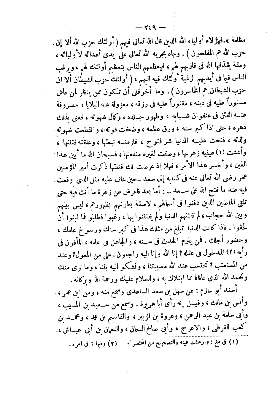 مُظْلِمَةٍ» فَهَؤُلَاءِ أَوْلِيَاءُ اللهِ الَّذِينَ قَالَ اللهُ تَعَالَى فِيهِمْ {أُولَئِكَ حِزْبُ اللهِ أَلَا إِنَّ حِزْبَ اللهِ هُمُ الْمُفْلِحُونَ} [المجادلة: 22] وِجَاهٌ يُجْرِيهِ اللهُ تَعَالَى عَلَى يَدَيْ أَعْدَائِهِ لِأَوْلِيَائِهِ وَمِقَةٌ يَقْذِفُهَا اللهُ فِي قُلُوبِهِمْ لَهُمْ، فَيُعَظِّمُهُمُ النَّاسُ بِتَعْظِيمِ أُولَئِكَ لَهُمْ، وَيَرْغَبُ النَّاسُ فِيمَا فِي أَيْدِيهِمْ لِرَغْبَةِ أُولَئِكَ فِيهِ إِلَيْهِمْ، {أُولَئِكَ حِزْبُ الشَّيْطَانِ أَلَا إِنَّ حِزْبَ الشَّيْطَانِ هُمُ الْخَاسِرُونَ} [المجادلة: 19] وَمَا أَخْوَفَنِي أَنْ تَكُونَ مِمَّنْ يَنْظُرُ لِمَنْ عَاشَ مَسْتُورًا عَلَيْهِ فِي دِينِهِ، مَقْتُورًا عَلَيْهِ فِي رِزْقِهِ، مَعْزُولَةً عَنْهُ الْبَلَايَا، مَصْرُوفَةً عَنْهُ الْفِتَنُ فِي عُنْفُوَانِ شَبَابِهِ، وَظُهُورِ جَلَدِهِ، وَكَمَالِ شَهْوَتِهِ، فَعَنَّى بِذَلِكَ دَهْرَهُ حَتَّى إِذَا كَبُرَ سِنُّهُ، وَرَقَّ عَظْمُهُ، وَضَعُفَتْ قُوَّتُهُ، وَانْقَطَعَتْ شَهْوَتُهُ وَلَذَّتُهُ فُتِحَتْ عَلَيْهِ الدُّنْيَا شَرَّ فُتُوحٍ، فَلَزِمَتْهُ تَبِعَتُهَا، وَعَلِقَتْهُ فِتْنَتُهَا، وَأَغْشَتْ عَيْنَيْهِ زَهْرَتُهَا، وَصَفَتْ لِغَيْرِهِ مَنْفَعَتُهَا فَسُبْحَانَ اللهِ، مَا أَبْيَنَ هَذَا الْغَبْنَ، وَأَخْسَرَ هَذَا الْأَمْرَ فَهَلَّا إِذْ عُرِضَتْ لَكَ فِتْنَتُهَا ذَكَرْتَ أَمِيرَ الْمُؤْمِنِينَ عُمَرَ رَضِيَ اللهُ تَعَالَى عَنْهُ فِي كِتَابِهِ إِلَى سَعْدٍ حِينَ خَافَ عَلَيْهِ مِثْلَ الَّذِي وَقَعْتَ فِيهِ عِنْدَمَا فَتْحَ اللهُ عَلَى سَعْدٍ: أَمَّا بَعْدُ فَأَعْرِضْ عَنْ زَهْرَةِ مَا أَنْتَ فِيهِ حَتَّى تَلْقَى الْمَاضِينَ الَّذِينَ دُفِنُوا فِي أَسْمَالِهِمْ، لَاصِقَةً بُطُونُهُمْ بِظُهُورِهِمْ، لَيْسَ بَيْنَهُمْ وَبَيْنَ اللهِ حِجَابٌ، لَمْ تَفْتِنْهُمُ الدُّنْيَا، وَلَمْ يُفْتَنُوا بِهَا، رَغِبُوا فَطَلَبُوا فَمَا لَبِثُوا أَنْ لَحِقُوا، فَإِذَا كَانَتِ الدُّنْيَا تَبْلُغُ مِنْ مِثْلِكَ هَذَا فِي كِبَرِ سِنِّكَ وَرُسُوخِ عِلْمِكَ وَحُضُورِ أَجَلِكَ، فَمَنْ يَلُومُ الْحَدَثَ فِي سِنِّهِ، وَالْجَاهِلَ فِي عِلْمِهِ، الْمَأْفُونَ فِي رَأْيِهِ، الْمَدْخُولَ فِي عَقْلِهِ، إِنَّا لِلَّهِ وَإِنَّا إِلَيْهِ رَاجِعُونَ، عَلَى مَنِ الْمُعَوِّلُ وَعِنْدَ مَنِ الْمُسْتَعْتَبُ، نَحْتَسِبُ عِنْدَ اللهِ مُصِيبَتَنَا، وَنَشْكُو إِلَيْهِ بَثَّنَا، وَمَا نَرَى مِنْكَ، وَنَحْمَدُ اللهَ الَّذِي عَافَانَا مِمَّا ابْتَلَاكَ بِهِ، وَالسَّلَامُ عَلَيْكَ وَرَحْمَةُ اللهِ وَبَرَكَاتُهُ " أَسْنَدَ أَبُو حَازِمٍ: عَنْ سَهْلِ بْنِ سَعْدٍ السَّاعِدِيِّ، وَسَمِعَ مِنْهُ، وَمِنِ ابْنِ عُمَرَ وَأَنَسِ بْنِ مَالِكٍ، وَقِيلَ: إِنَّهُ رَأَى أَبَا هُرَيْرَةَ، وَسَمِعَ مِنْ سَعِيدِ بْنِ الْمُسَيِّبِ، وَأَبِي سَلَمَةَ بْنِ عَبْدِ الرَّحْمَنِ، وَعُرْوَةَ بْنِ الزُّبَيْرِ، وَالْقَاسِمِ بْنِ مُحَمَّدٍ، وَمُحَمَّدِ بْنِ كَعْبٍ الْقُرَظِيِّ، وَالْأَعْرَجِ، وَأَبِي صَالِحٍ السَّمَّانِ، وَالنُّعْمَانِ بْنِ أَبِي عَيَّاشٍ،