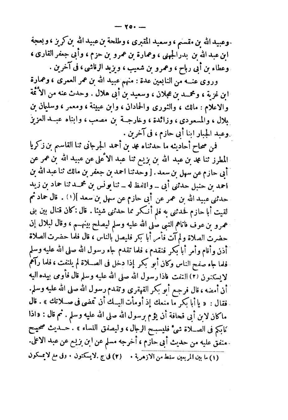 فَمِنْ صِحَاحِ أَحَادِيثِهِ مَا حَدَّثَنَاهُ مُحَمَّدُ بْنُ أَحْمَدَ الْجُرْجَانِيُّ، ثَنَا الْقَاسِمُ بْنُ زَكَرِيَّا الْمُطَرِّزُ، ثَنَا مُحَمَّدُ بْنُ عَبْدِ اللهِ بْنِ بَزِيعٍ، ثَنَا عَبْدُ الْأَعْلَى، عَنْ عُبَيْدِ اللهِ بْنِ عُمَرَ، عَنْ أَبِي حَازِمٍ، عَنْ سَهْلِ بْنِ سَعْدٍ، وَحَدَّثَنَا أَحْمَدُ بْنُ جَعْفَرِ بْنِ مَالِكٍ، ثَنَا عَبْدُ اللهِ بْنُ أَحْمَدَ بْنِ حَنْبَلٍ، حَدَّثَنِي أَبِي، وَاللَّفْظُ لَهُ، ثَنَا يُونُسُ بْنُ مُحَمَّدٍ، ثَنَا ابْنُ زَيْدٍ، حَدَّثَنِي عُبَيْدُ اللهِ بْنُ عُمَرَ، عَنْ أَبِي حَازِمٍ، عَنْ سَهْلِ بْنِ سَعْدٍ، قَالَ حَمَّادٌ: ثُمَّ لَقِيتُ أَبَا حَازِمٍ فَحَدَّثَنِي بِهِ، فَلَمْ أُنْكِرْ مِمَّا حَدَّثَنِي شَيْئًا، قَالَ: " كَانَ قِتَالٌ بَيْنَ بَنِي عَمْرِو بْنِ عَوْفٍ فَأَتَاهُمُ النَّبِيُّ صَلَّى اللهُ عَلَيْهِ وَسَلَّمَ لِيُصْلِحَ بَيْنَهُمْ، وَقَالَ لِبِلَالٍ: «§إِنْ حَضَرَتِ الصَّلَاةُ وَلَمْ آتِ فَأْمُرْ أَبَا بَكْرٍ فَلْيصَلِّ بِالنَّاسِ» قَالَ: فَلَمَّا حَضَرَتِ الصَّلَاةُ أَذَّنَ وَأَقَامَ، وَأَمَرَ أَبَا بَكْرٍ فَتَقَدَّمَ، فَلَمَّا تَقَدَّمَ جَاءَ رَسُولُ اللهِ صَلَّى اللهُ عَلَيْهِ وَسَلَّمَ، فَلَمَّا جَاءَ صَفَّقَ النَّاسُ، وَكَانَ أَبُو بَكْرٍ إِذَا دَخَلَ فِي الصَّلَاةِ لَمْ يَلْتَفِتْ، فَلَمَّا رَآهُمْ لَا يَسْكُنُونَ الْتَفَتَ، فَإِذَا رَسُولُ اللهِ صَلَّى اللهُ عَلَيْهِ وَسَلَّمَ قَالَ: فَأَوْمَى بِيَدِهِ إِلَيْهِ أَنِ امْضِهِ، قَالَ: فَرَجَعَ أَبُو بَكْرٍ الْقَهْقَرَى، وَتَقَدَّمَ رَسُولُ اللهِ صَلَّى اللهُ عَلَيْهِ وَسَلَّمَ، فَقَالَ: «يَا أَبَا بَكْرٍ مَا مَنَعَكَ إِذْ أَوْمَأْتُ إِلَيْكَ أَنْ تَمْضِيَ فِي صَلَاتِكَ» قَالَ: مَا كَانَ لِابْنِ أَبِي قُحَافَةَ أَنْ يَؤُمَّ بِرَسُولِ اللهِ صَلَّى اللهُ عَلَيْهِ وَسَلَّمَ، ثُمَّ قَالَ: «إِذَا نَابَكُمْ فِي الصَّلَاةِ شَيْءٌ فَلْيُسَبِّحِ الرِّجَالُ وَلْيُصَفِّقِ النِّسَاءُ» حَدِيثٌ صَحِيحٌ مُتَّفَقٌ عَلَيْهِ مِنْ حَدِيثِ أَبِي حَازِمٍ، أَخْرَجَهُ مُسْلِمٌ عَنِ ابْنِ بَزِيعٍ، عَنْ عَبْدِ الْأَعْلَى، -[251]- وَاتَّفَقَ هُوَ وَالْبُخَارِيُّ فِيهِ عَنْ مَالِكٍ، وَيَعْقُوبَ الْقَارِيِّ عَنْ أَبِي حَازِمٍ، وَانْفَرَدَ الْبُخَارِيُّ بِرِوَايَةِ حَدِيثِ الثَّوْرِيِّ وَابْنِ حَازِمٍ وَحَمَّادِ بْنِ زَيْدٍ، وَمُحَمَّدِ بْنِ جَعْفَرِ بْنِ أَبِي كَثِيرٍ فِيهِ عَنْ أَبِي حَازِمٍ وَمِمَّنْ رَوَى هَذَا الْحَدِيثَ عَنْ أَبِي حَازِمٍ مِمَّنْ لَا يَذْكُرَاهُ: مَعْمَرٌ وَأَبُو غَسَّانَ مُحَمَّدُ بْنُ مُطَرِّفٍ وَعَبْدُ الْعَزِيزِ بْنُ الْمَاجِشُونِ وَمُحَمَّدُ بْنُ عَجْلَانَ وَهِشَامُ بْنُ سَعْدٍ وَعَبْدُ الرَّحْمَنِ بْنُ إِسْحَاقَ وَسُفْيَانُ بْنُ عُيَيْنَةَ وَالْحَمَّادَانِ وَعَبْدُ اللهِ بْنُ عَبْدِ الرَّحْمَنِ الْجُمَحِيُّ وَعَبْدُ الْحَمِيدِ بْنُ سُلَيْمَانَ أَخُو فُلَيْحٍ وَعَبْدُ الْعَزِيزِ بْنُ أَبِي حَازِمٍ وَيَعْقُوبُ بْنُ الْوَلِيدِ وَمُحَمَّدُ بْنُ عَبْدِ الرَّحْمَنِ بْنِ أَبِي مُلَيْكَةَ وَعُمَرُ بْنُ عَلِيٍّ الْمُقَدَّمِيُّ وَمُوسَى بْنُ مُحَمَّدٍ الْأَنْصَارِيُّ وَجَرِيرُ بْنُ حَازِمٍ وَخَارِجَةُ بْنُ مُصْعَبٍ فِي آخَرِينَ، مِنْهُمْ مَنْ سَاقَهُ مُطَوَّلًا، وَمِنْهُمْ مَنْ رَوَاهُ مُخْتَصَرًا، فَقَالَ: التَّسْبِيحُ لِلرِّجَالِ وَالتَّصْفِيقُ لِلنِّسَاءِ