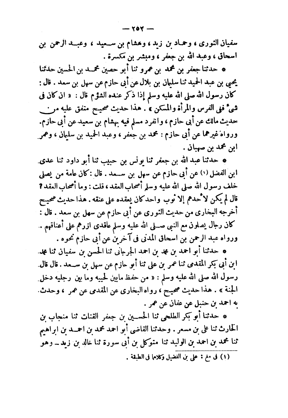 حَدَّثَنَا أَبُو أَحْمَدَ بْنُ مُحَمَّدِ بْنِ أَحْمَدَ الْجُرْجَانِيُّ، ثَنَا الْحَسَنُ بْنُ سُفْيَانَ، ثَنَا مُحَمَّدُ بْنُ أَبِي بَكْرٍ الْمُقَدَّمِيُّ، ثَنَا عُمَرُ بْنُ عَلِيٍّ، ثَنَا أَبُو حَازِمٍ، عَنْ سَهْلِ بْنِ سَعْدٍ، قَالَ: قَالَ رَسُولُ اللهِ صَلَّى اللهُ عَلَيْهِ وَسَلَّمَ: «§مَنْ حَفِظَ مَا بَيْنَ لَحْيَيْهِ وَمَا بَيْنَ رِجْلَيْهِ دَخَلَ الْجَنَّةَ» هَذَا حَدِيثٌ صَحِيحٌ رَوَاهُ الْبُخَارِيُّ عَنِ الْمُقَدَّمِيِّ، عَنْ عُمَرَ، وَحَدَّثَ بِهِ أَحْمَدُ بْنُ حَنْبَلٍ عَنْ عَفَّانَ عَنْ عُمَرَ
