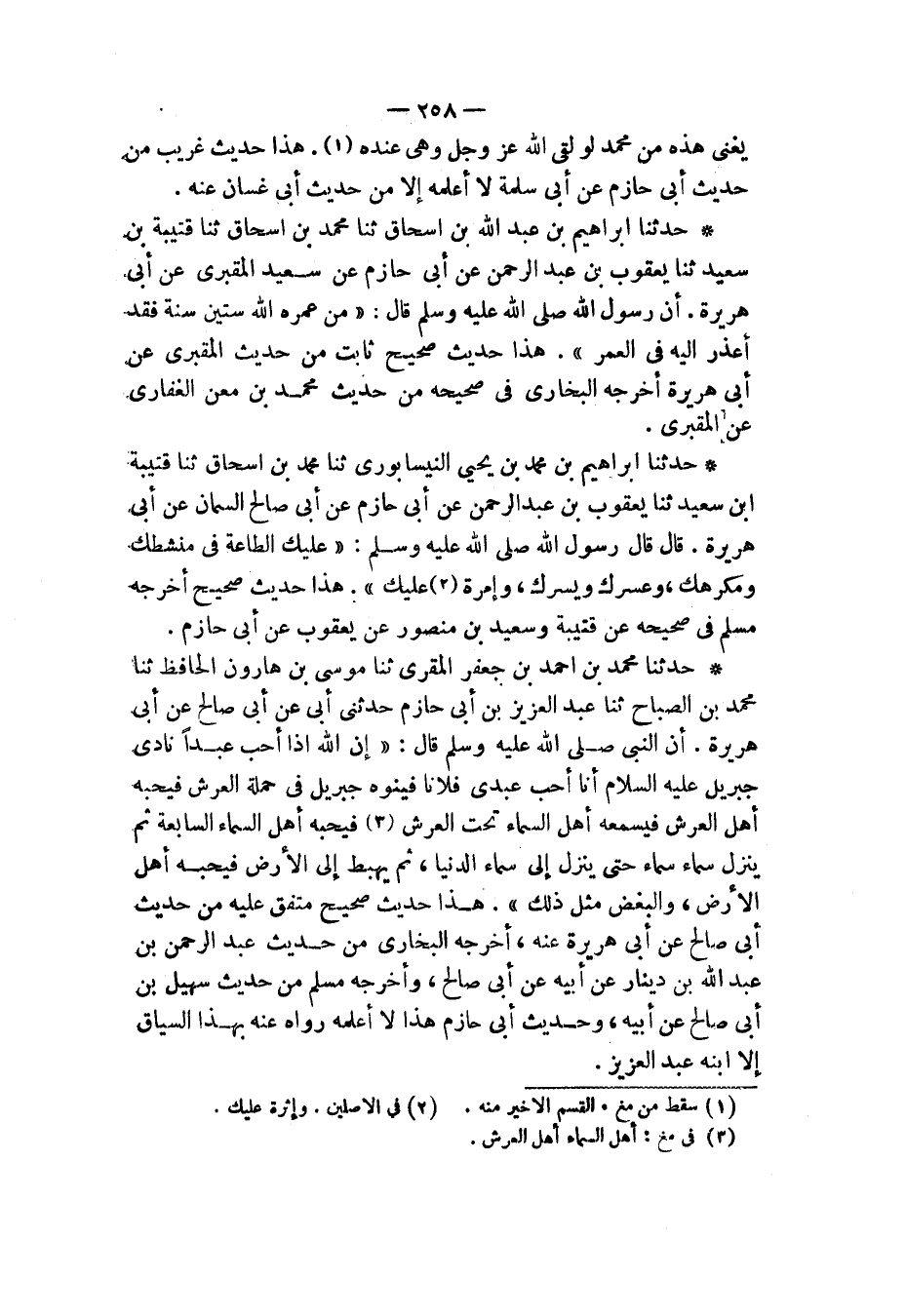 حَدَّثَنَا إِبْرَاهِيمُ بْنُ عَبْدِ اللهِ بْنِ إِسْحَاقَ، ثَنَا مُحَمَّدُ بْنُ إِسْحَاقَ، ثَنَا قُتَيْبَةُ بْنُ سَعِيدٍ، ثَنَا يَعْقُوبُ بْنُ عَبْدِ الرَّحْمَنِ، عَنْ أَبِي حَازِمٍ، عَنْ سَعِيدٍ الْمَقْبُرِيِّ، عَنْ أَبِي هُرَيْرَةَ، أَنَّ رَسُولَ اللهِ صَلَّى اللهُ عَلَيْهِ وَسَلَّمَ قَالَ: «§مَنْ عَمَّرَهُ اللهُ سِتِّينَ سَنَةً، فَقَدْ أَعْذَرَ إِلَيْهِ فِي الْعُمُرِ» هَذَا حَدِيثٌ صَحِيحٌ ثَابِتٌ مِنْ حَدِيثِ الْمَقْبُرِيِّ، عَنْ أَبِي هُرَيْرَةَ أَخْرَجَهُ الْبُخَارِيُّ فِي صَحِيحِهِ مِنْ حَدِيثِ مُحَمَّدِ بْنِ مَعْنٍ الْغِفَارِيِّ عَنِ الْمَقْبُرِيِّ