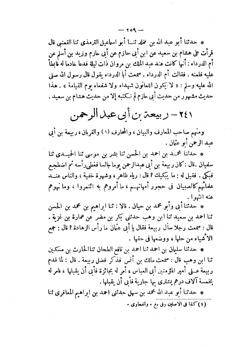 §رَبِيعَةُ بْنُ أَبِي عَبْدِ الرَّحْمَنِ وَمِنْهُمْ صَاحِبُ الْمَعَارِفِ وَالْبَيَانِ، وَالْمَحَارِفِ وَالْقُرْبَانِ، رَبِيعَةُ بْنُ أَبِي عَبْدِ الرَّحْمَنِ أَبُو عُثْمَانَ
