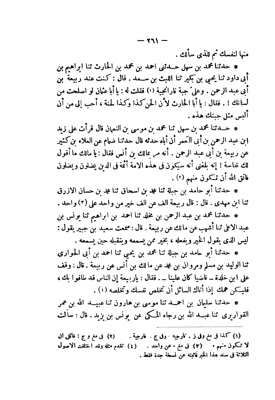 حَدَّثَنَا مُحَمَّدُ بْنُ سَهْلٍ، ثَنَا مُحَمَّدُ بْنُ مُوسَى بْنِ النُّعْمَانِ، قَالَ: قَرَأْتُ عَلَى زَيْدِ بْنِ عَبْدِ الرَّحْمَنِ بْنِ أَبِي الْعُمَرِ أَنَّ أَبَاهُ، حَدَّثَهُ قَالَ: حَدَّثَنَا ضِمَامٌ، عَنِ الْعَلَاءِ بْنِ كَثِيرٍ، عَنْ رَبِيعَةَ بْنِ أَبِي عَبْدِ الرَّحْمَنِ: " أَنَّهُ مَرَّ بِمَالِكِ بْنِ أَنَسٍ فَقَالَ: «§يَا مَالِكُ مَا أَقُولُ لَكَ نَفَاسَةً، إِنَّهُ بَلَغَنِي أَنَّهُ سَيَكُونُ فِي هَذِهِ الْأُمَّةِ أَئِمَّةٌ فِي الدِّينِ يَضِلُّونَ وَيُضِلُّونَ، فَاتَّقِ اللهَ أَنْ تَكُونَ مِنْهُمْ»