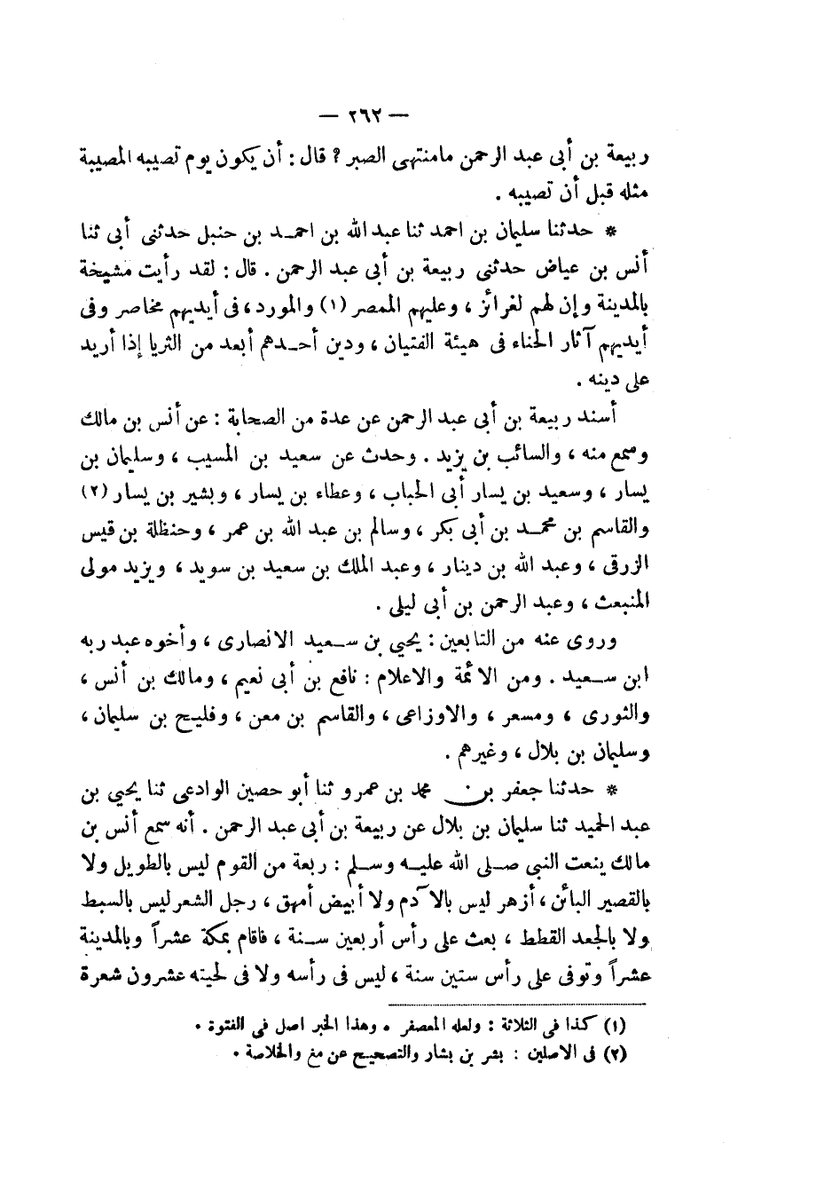 حَدَّثَنَا سُلَيْمَانُ بْنُ أَحْمَدَ، ثَنَا عَبْدُ اللهِ بْنُ أَحْمَدَ بْنِ حَنْبَلٍ، حَدَّثَنِي أَبِي، ثَنَا أَنَسُ بْنُ عِيَاضٍ، حَدَّثَنِي رَبِيعَةُ بْنُ أَبِي عَبْدِ الرَّحْمَنِ، قَالَ: «§لَقَدْ رَأَيْتُ مَشْيَخَةً بِالْمَدِينَةِ، وَإِنَّ لَهُمْ لَغَرَائِزَ، وَعَلَيْهِمُ الْمُمْصِرَ وَالْمُورِدَ، فِي أَيْدِيهِمْ مَخَاصِرُ، وَفِي أَيْدِيهِمْ آثَارُ الْحِنَّاءِ فِي هَيْئَةِ الْفِتْيَانِ، وَدِينُ أَحَدِهِمْ أَبْعَدُ مِنَ الثُّرَيَّاءِ إِذَا أُرِيدَ عَلَى دِينِهِ» أَسْنَدَ رَبِيعَةُ بْنُ أَبِي عَبْدِ الرَّحْمَنِ عَنْ عِدَّةٍ مِنَ الصَّحَابَةِ عَنْ أَنَسِ بْنِ مَالِكٍ، وَسَمِعَ مِنْهُ، وَالسَّائِبِ بْنِ يَزِيدَ، وَحَدَّثَ عَنْ سَعِيدِ بْنِ الْمُسَيِّبِ، وَسُلَيْمَانَ بْنِ يَسَارٍ، وَسَعِيدِ بْنِ يَسَارٍ أَبِي الْحُبَابِ وَعَطَاءِ بْنِ يَسَارٍ وَبَشِيرِ بْنِ يَسَارٍ وَالْقَاسِمِ بْنِ مُحَمَّدِ بْنِ أَبِي بَكْرٍ وَسَالِمِ بْنِ عَبْدِ اللهِ بْنِ عُمَرَ وَحَنْظَلَةَ بْنِ قَيْسٍ الزُّرَقِيِّ وَعَبْدِ اللهِ بْنِ دِينَارٍ وَعَبْدِ الْمَلِكِ بْنِ سَعِيدِ بْنِ سُوَيْدٍ وَيَزِيدَ مَوْلَى الْمُنْبَعِثِ وَعَبْدِ الرَّحْمَنِ بْنِ أَبِي لَيْلَى، وَرَوَى عَنْهُ مِنَ التَّابِعِينَ: يَحْيَى بْنُ سَعِيدٍ الْأَنْصَارِيُّ وَأَخُوهُ عَبْدُ رَبِّهِ بْنُ سَعِيدٍ، وَمِنَ الْأَئِمَّةِ وَالْأَعْلَامِ: نَافِعُ بْنُ أَبِي نُعَيْمٍ وَمَالِكُ بْنُ أَنَسٍ وَالثَّوْرِيُّ وَمِسْعَرٌ وَالْأَوْزَاعِيُّ وَالْقَاسِمُ بْنُ مَعْنٍ وَفُلَيْحُ بْنُ سُلَيْمَانَ وَسُلَيْمَانُ بْنُ بِلَالٍ وَغَيْرُهُمْ