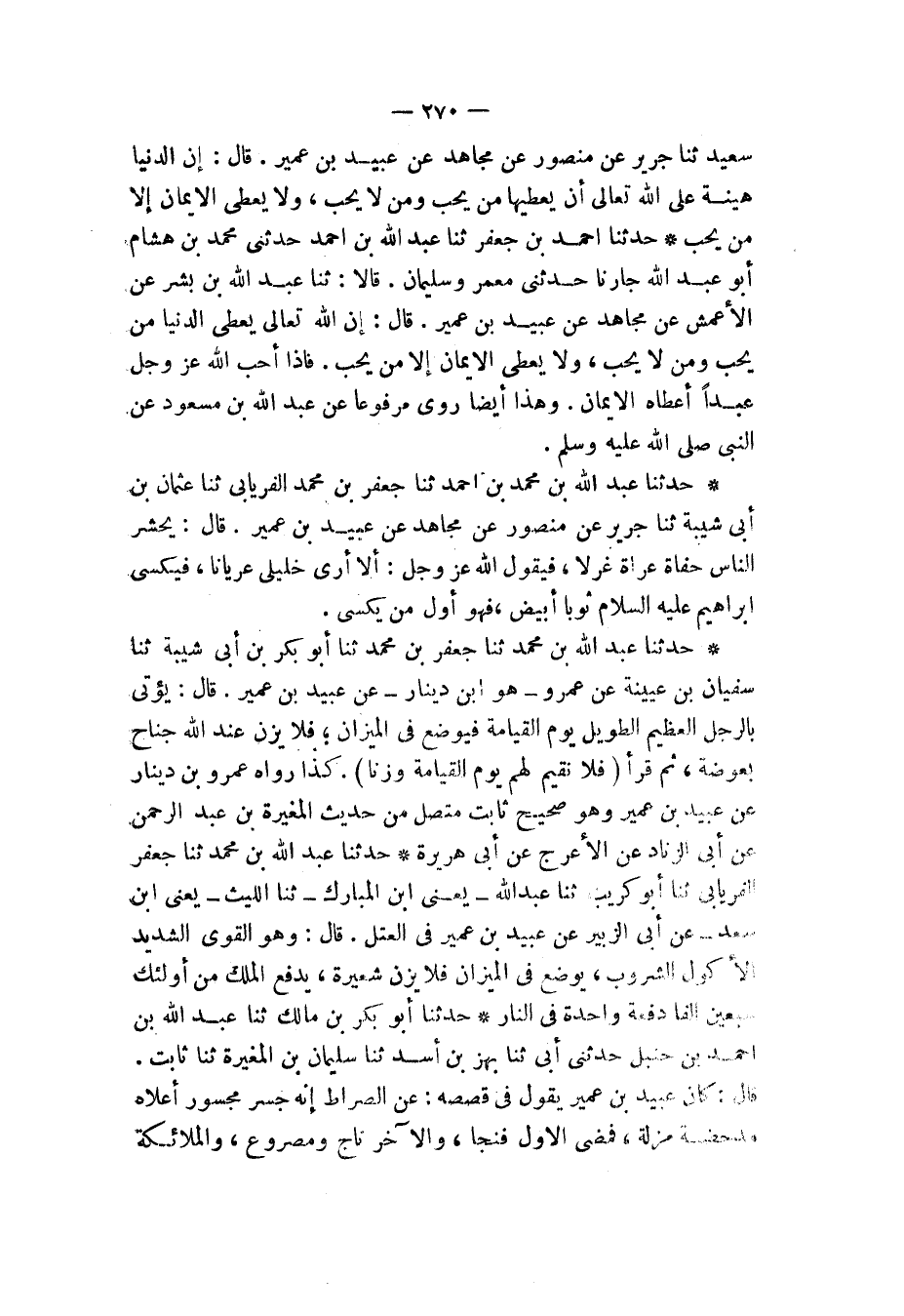 حَدَّثَنَا أَحْمَدُ بْنُ جَعْفَرٍ، ثنا عَبْدُ اللهِ بْنُ أَحْمَدَ، حَدَّثَنِي مُحَمَّدُ بْنُ هِشَامٍ أَبُو عَبْدِ اللهِ، جَارُنَا حَدَّثَنِي مَعْمَرٌ، وَسُلَيْمَانُ، قَالَا: ثنا عَبْدُ اللهِ بْنُ بِشْرٍ، عَنِ الْأَعْمَشِ، عَنْ مُجَاهِدٍ، عَنْ عُبَيْدِ بْنِ عُمَيْرٍ، قَالَ: «إِنَّ §اللهَ تَعَالَى يُعْطِي الدُّنْيَا مَنْ يُحِبُّ وَمَنْ لَا يُحِبُّ، وَلَا يُعْطِي الْإِيمَانَ إِلَّا مَنْ يُحِبُّ، فَإِذَا أَحَبَّ اللهُ عَزَّ وَجَلَّ عَبْدًا أَعْطَاهُ الْإِيمَانَ» وَهَذَا أَيْضًا رُوِيَ مَرْفُوعًا، عَنْ عَبْدِ اللهِ بْنِ مَسْعُودٍ، عَنِ النَّبِيِّ صَلَّى اللهُ عَلَيْهِ وَسَلَّمَ