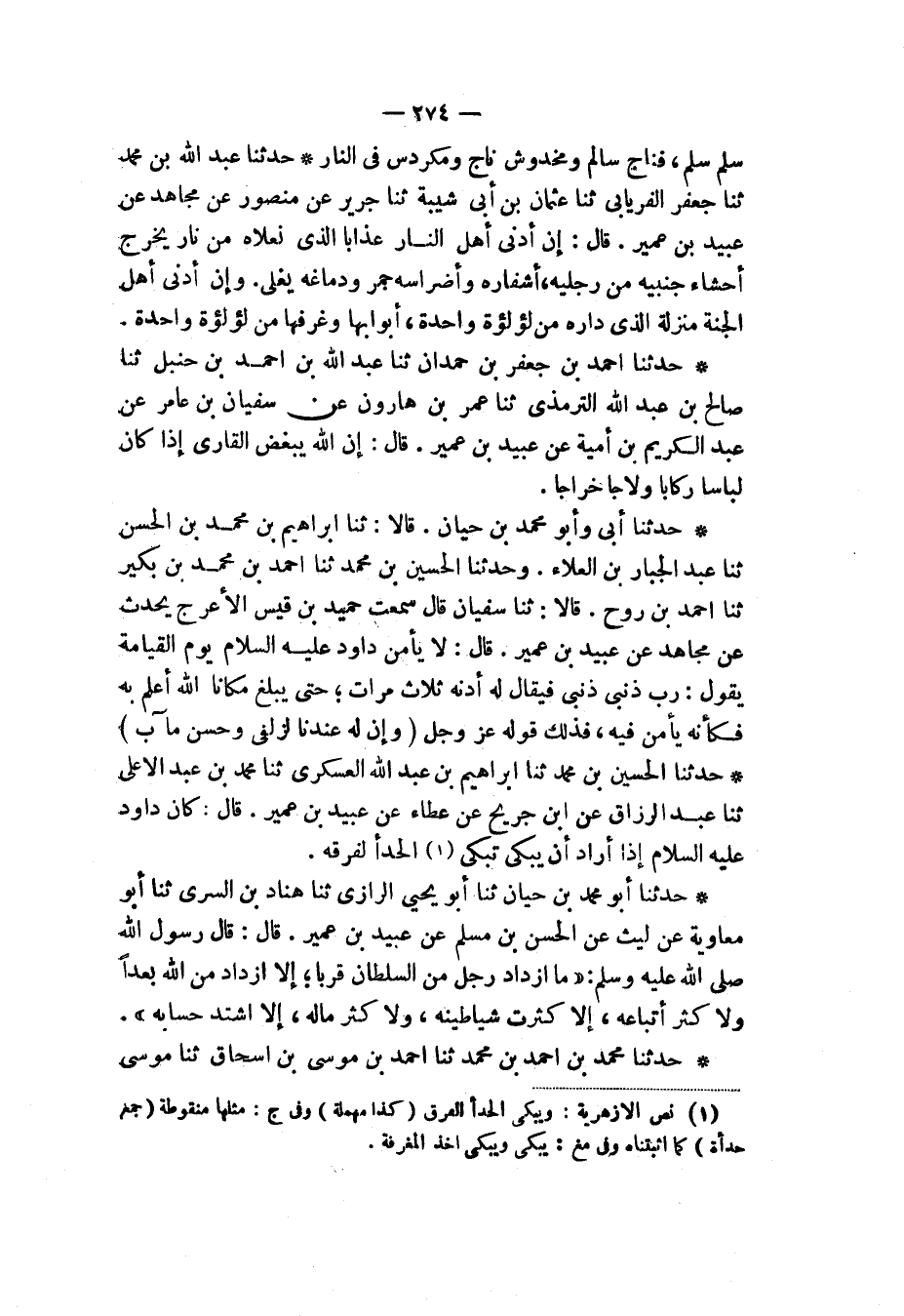 حَدَّثَنَا الْحُسَيْنُ بْنُ مُحَمَّدٍ، ثَنَا إِبْرَاهِيمُ بْنُ عَبْدِ اللهِ الْعَسْكَرِيُّ، ثَنَا مُحَمَّدُ بْنُ عَبْدِ الْأَعْلَى، ثَنَا عَبْدُ الرَّزَّاقِ، عَنِ ابْنِ جُرَيْجٍ، عَنْ عَطَاءٍ، عَنْ عُبَيْدِ بْنِ عُمَيْرٍ، قَالَ: «§كَانَ دَاوُدُ عَلَيْهِ السَّلَامُ إِذَا أَرَادَ أَنْ يَبْكِيَ تَبْكِي الْحِدَأُ لِفَرَقِهِ»
