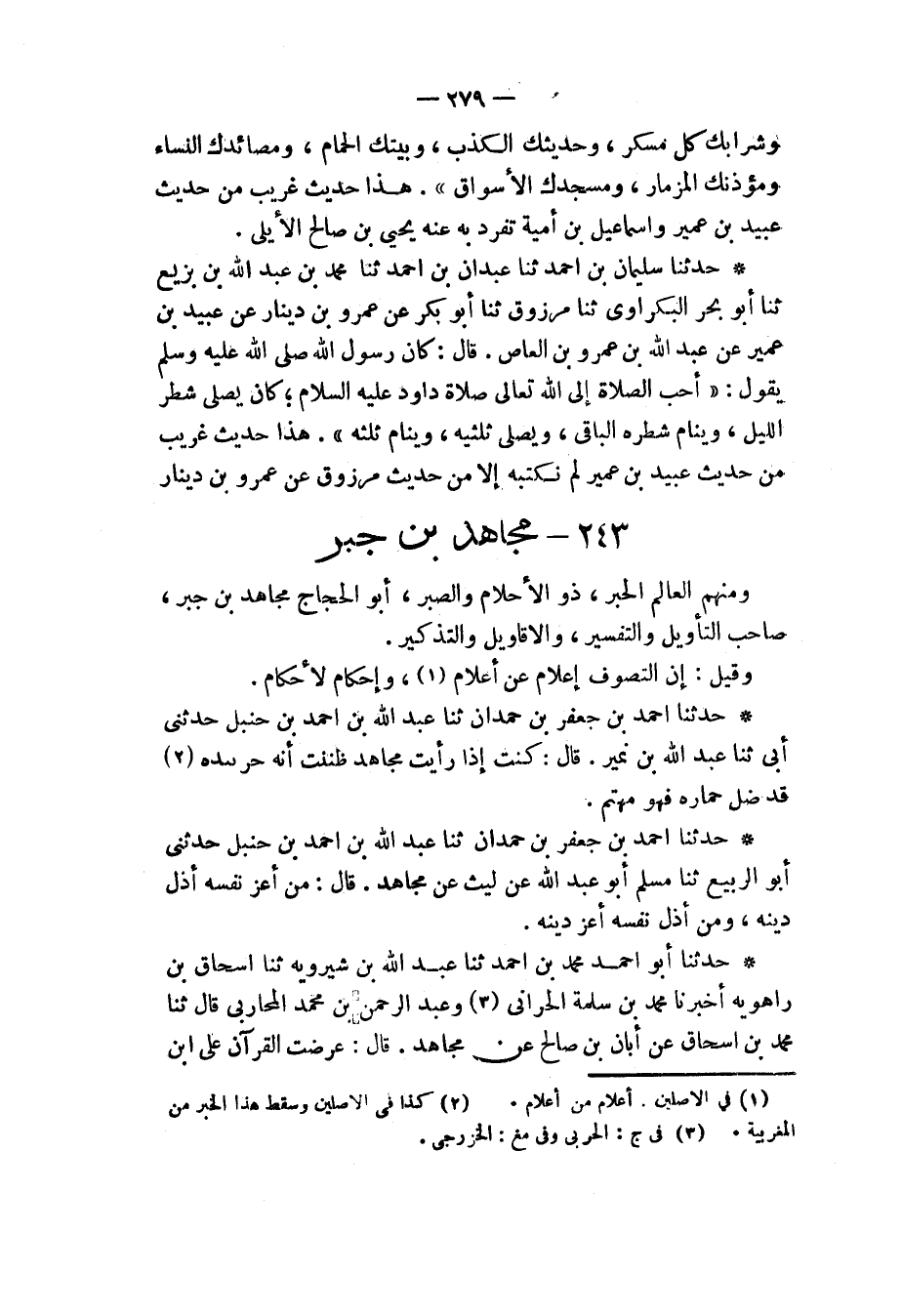 §مُجَاهِدُ بْنُ جَبْرٍ وَمِنْهُمُ الْعَالِمُ الْحَبْرُ ذُو الْأَحْلَامِ وَالصَّبْرِ، أَبُو الْحَجَّاجِ مُجَاهِدُ بْنُ جَبْرٍ، صَاحِبُ التَّأْوِيلِ وَالتَّفْسِيرِ، وَالْأَقَاوِيلِ وَالتَّذْكِيرِ. وَقِيلَ: إِنَّ التَّصَوُّفَ إِعْلَامٌ عَنْ أَعْلَامٍ، وَإِحْكَامٌ لِأَحْكَامٍ