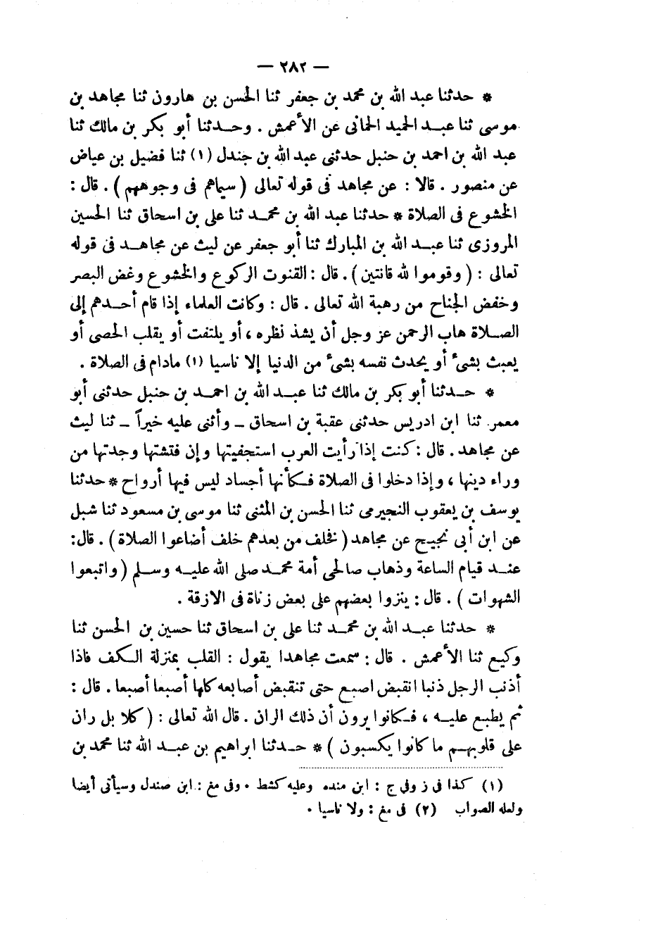 حَدَّثَنَا عَبْدُ اللهِ بْنُ مُحَمَّدِ بْنِ جَعْفَرٍ، ثَنَا الْحَسَنُ بْنُ هَارُونَ، ثَنَا مُجَاهِدُ بْنُ مُوسَى، ثَنَا عَبْدُ الْحَمِيدِ الْحِمَّانِيُّ، عَنِ الْأَعْمَشِ، وَحَدَّثَنَا أَبُو بَكْرِ بْنُ مَالِكٍ، ثَنَا عَبْدُ اللهِ بْنُ أَحْمَدَ بْنِ حَنْبَلٍ، حَدَّثَنِي عَبْدُ اللهِ بْنُ جَنْدَلٍ، ثَنَا فُضَيْلُ بْنُ عِيَاضٍ، عَنْ مَنْصُورٍ، قَالَا: عَنْ مُجَاهِدٍ فِي قَوْلِهِ تَعَالَى §سِيمَاهُمْ فِي وُجُوهِهِمْ قَالَ: «الْخُشُوعُ فِي الصَّلَاةِ»