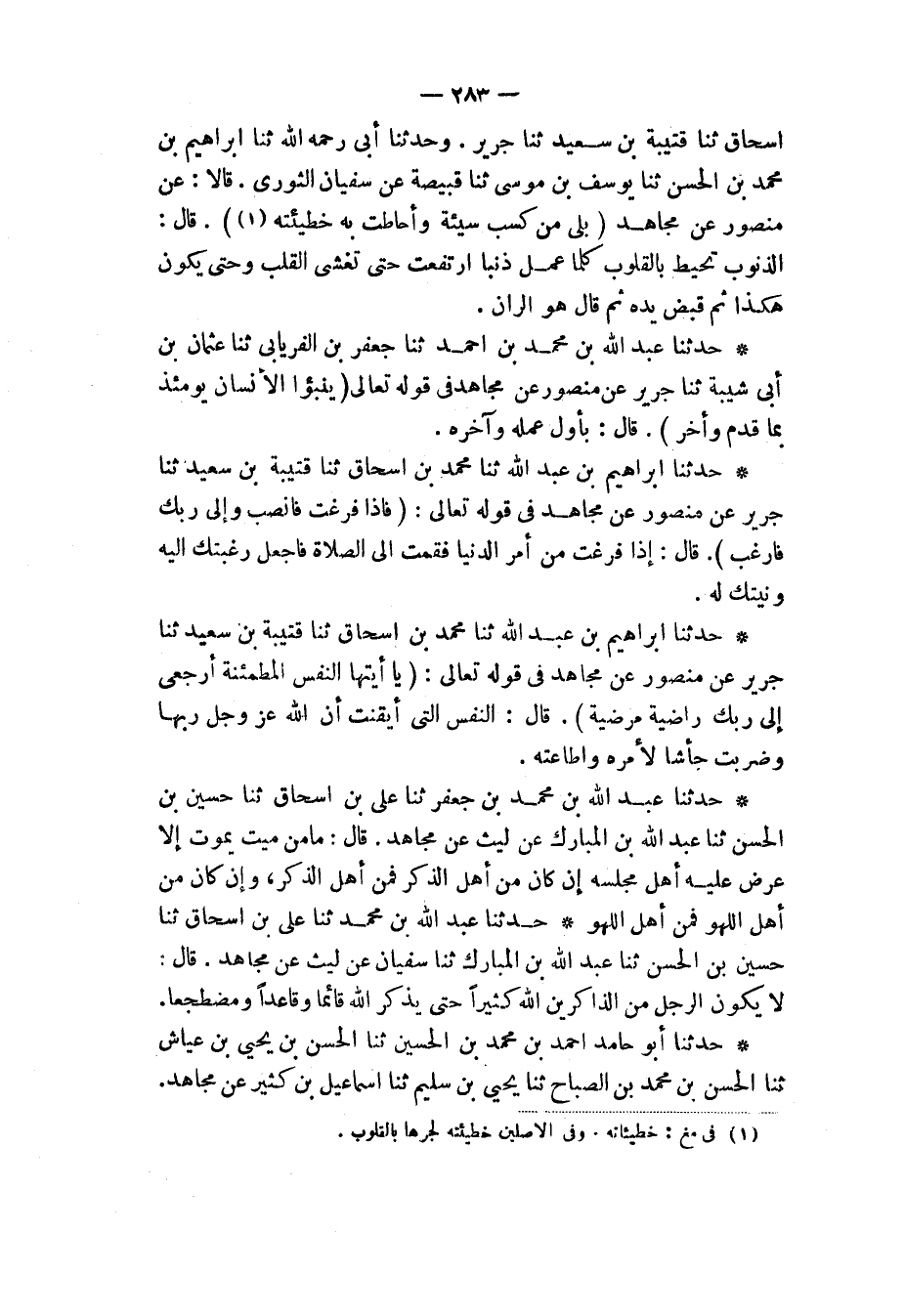 حَدَّثَنَا إِبْرَاهِيمُ بْنُ عَبْدِ اللهِ، ثَنَا مُحَمَّدُ بْنُ إِسْحَاقَ، ثَنَا قُتَيْبَةُ بْنُ سَعِيدٍ، ثَنَا جَرِيرٌ، عَنْ مَنْصُورٍ، عَنْ مُجَاهِدٍ فِي قَوْلِهِ تَعَالَى {§يَا أَيَّتُهَا النَّفْسُ الْمُطْمَئِنَّةُ ارْجِعِي إِلَى رَبِّكِ رَاضِيَةً مَرْضِيَّةً} [الفجر: 28] قَالَ: النَّفْسُ الَّتِي أَيْقَنَتْ أَنَّ اللهَ عَزَّ وَجَلَّ رَبَّهَا، وَضَرَبَتْ جَأْشًا لَأَمْرِهِ وَأَطَاعَتْهُ "