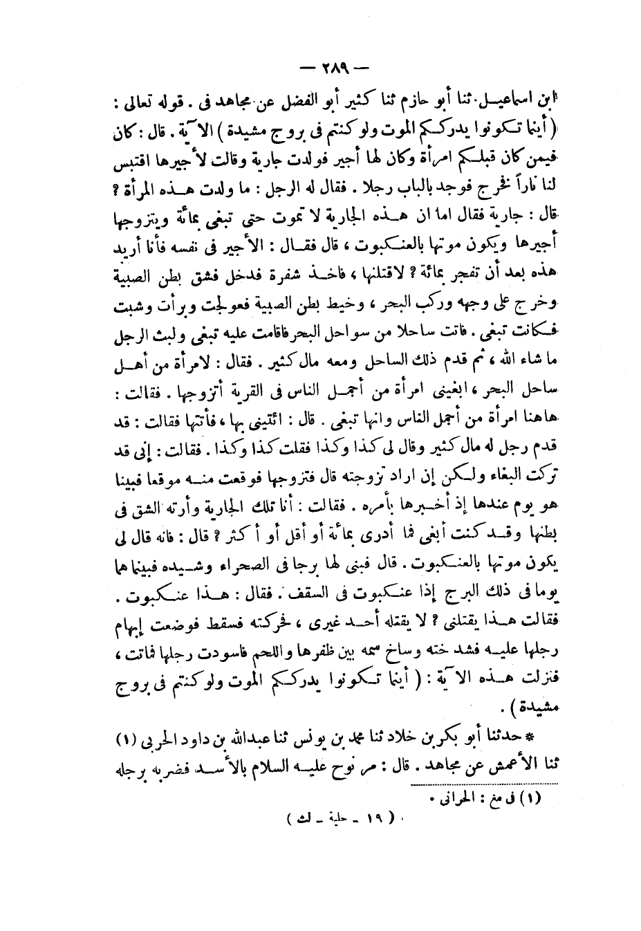 حَدَّثَنَا أَبُو بَكْرِ بْنُ خَلَّادٍ، ثَنَا مُحَمَّدُ بْنُ يُونُسَ، ثَنَا عَبْدُ اللهِ بْنُ دَاوُدَ الْخُرَيْبِيُّ، ثَنَا الْأَعْمَشُ، عَنْ مُجَاهِدٍ، قَالَ: " §مَرَّ نُوحٌ عَلَيْهِ السَّلَامُ بِالْأَسَدِ فَضَرَبَهُ بِرِجْلِهِ -[290]- فَخَمَشَهُ، فَبَاتَ سَاهِرًا فَشُكِيَ نُوحٌ ذَلِكَ إِلَى اللهِ عَزَّ وَجَلَّ، فَأَوْحَى اللهُ تَعَالَى إِلَيْهِ: إِنِّي لَا أُحِبُّ الظُّلْمَ "