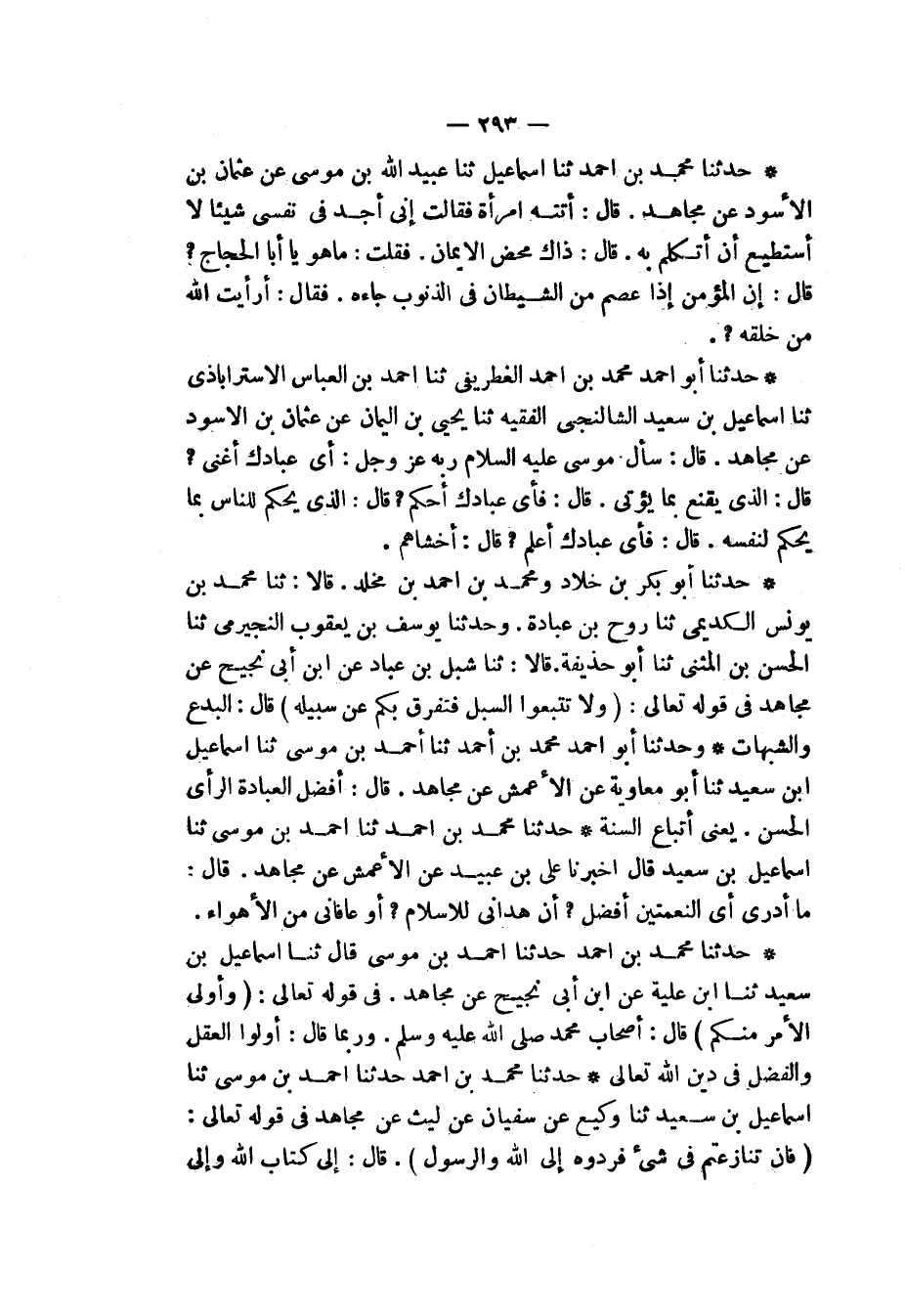 حَدَّثَنَا مُحَمَّدُ بْنُ أَحْمَدَ، ثَنَا إِسْمَاعِيلُ، ثَنَا عُبَيْدُ اللهِ بْنُ مُوسَى، عَنْ عُثْمَانَ بْنِ الْأَسْوَدِ، عَنْ مُجَاهِدٍ، قَالَ: " أَتَتْهُ امْرَأَةٌ فَقَالَتْ: إِنِّي أَجِدُ فِي نَفْسِي شَيْئًا لَا أَسْتَطِيعُ أَنْ أَتَكَلَّمَ بِهِ، قَالَ: ذَاكَ مَحْضُ الْإِيمَانِ، فَقُلْتُ: مَا هُوَ يَا أَبَا الْحَجَّاجِ؟ قَالَ: إِنَّ §الْمُؤْمِنَ إِذَا عُصِمَ مِنَ الشَّيْطَانِ فِي الذُّنُوبِ، جَاءَهُ فَقَالَ: أَرَأَيْتَ اللهَ مَنْ خَلَقَهُ؟ "