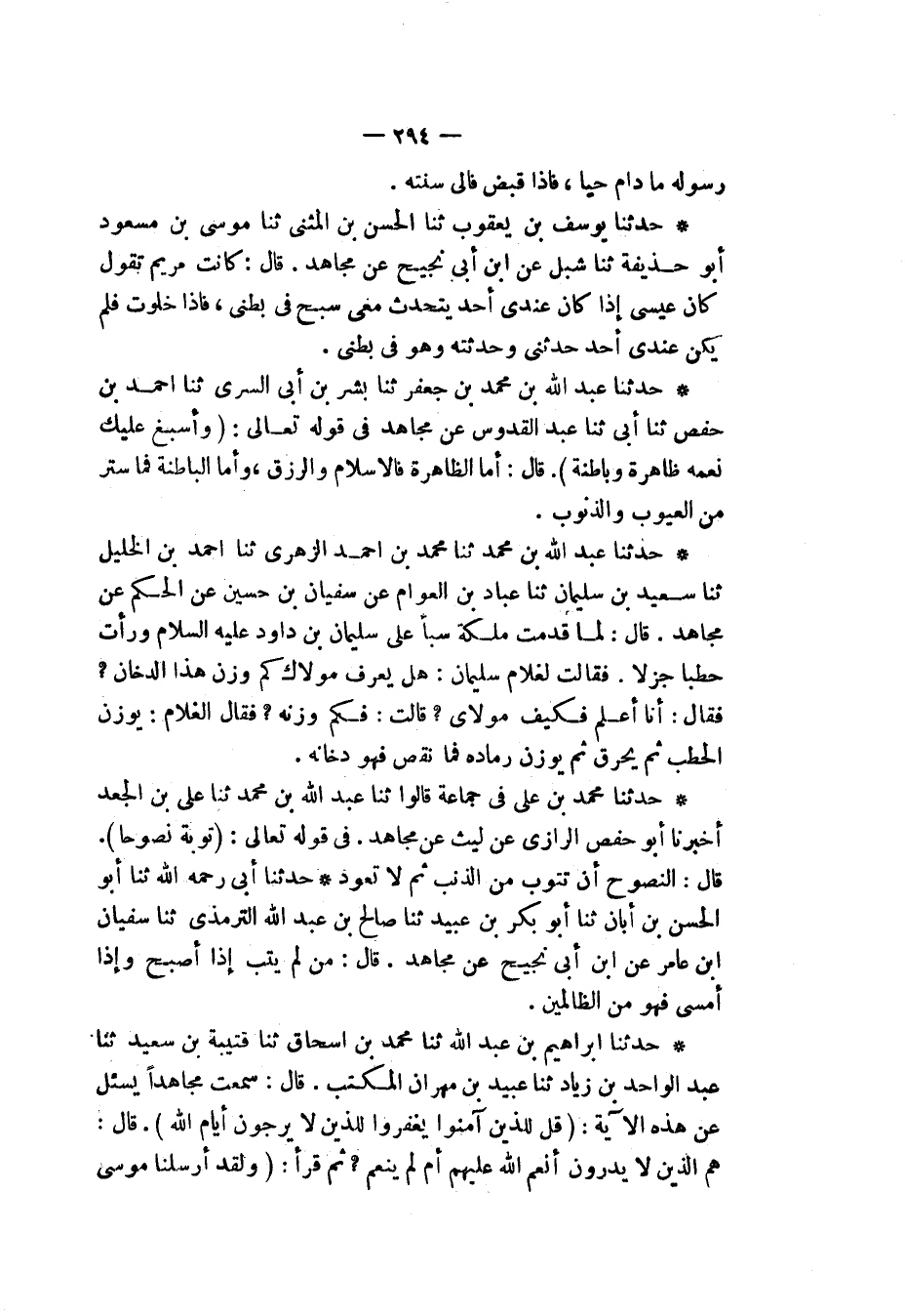 حَدَّثَنَا يُوسُفُ بْنُ يَعْقُوبَ، ثنا الْحَسَنُ بْنُ الْمُثَنَّى، ثَنَا مُوسَى بْنُ مَسْعُودٍ أَبُو حُذَيْفَةَ، ثَنَا شِبْلٌ، عَنِ ابْنِ أَبِي نَجِيحٍ، عَنْ مُجَاهِدٍ، قَالَ: " §كَانَتْ مَرْيَمُ تَقُولُ: كَانَ عِيسَى إِذَا كَانَ عِنْدِي أَحَدٌ يَتَحَدَّثُ مَعِي سَبَّحَ فِي بَطْنِي، فَإِذَا خَلَوْتُ فَلَمْ يَكُنْ عِنْدِي أَحَدٌ حَدَّثَنِي وَحَدَّثْتُهُ وَهُوَ فِي بَطْنِي "