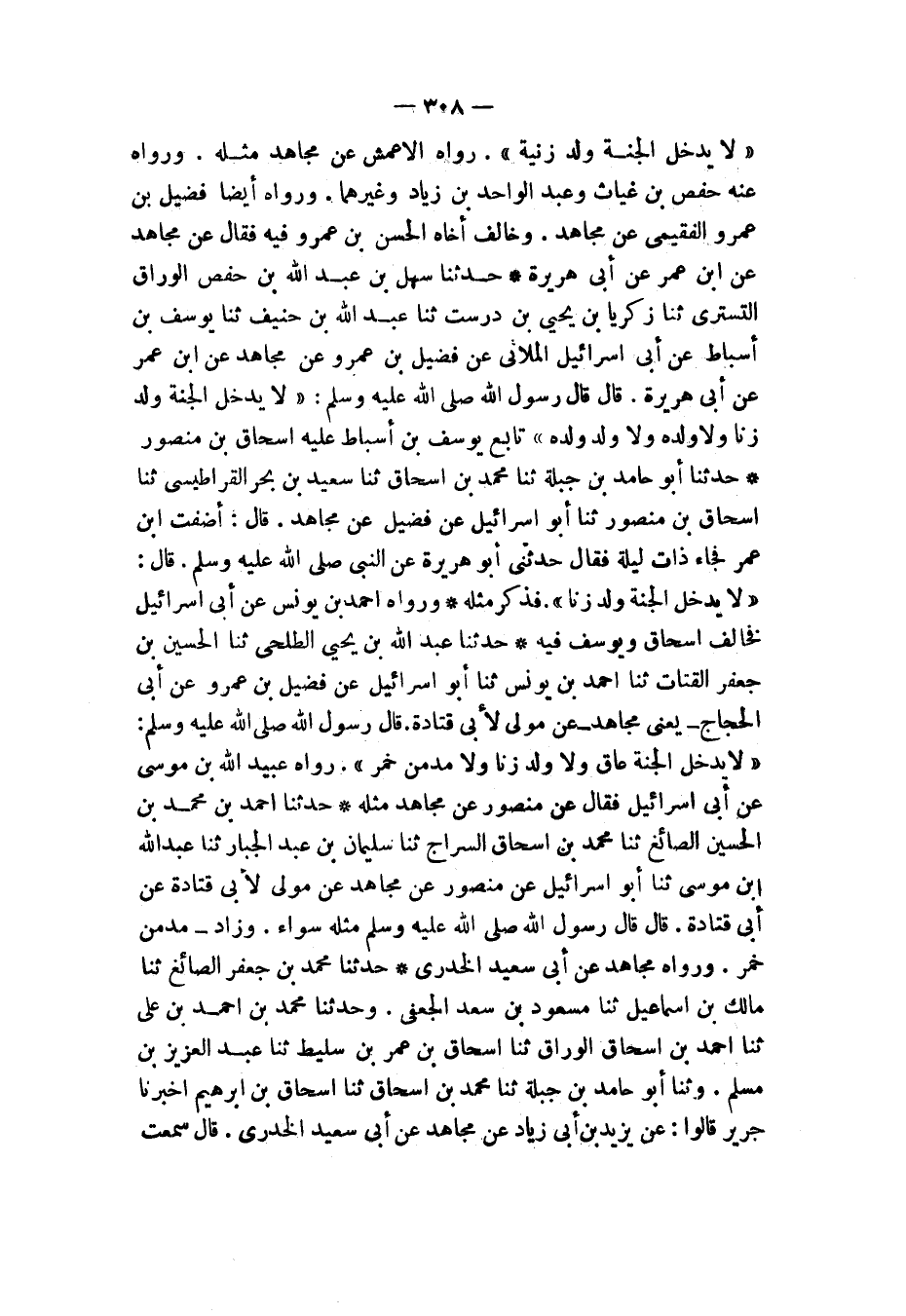 حَدَّثَنَا سَهْلُ بْنُ عَبْدِ اللهِ بْنِ حَفْصٍ الْوَرَّاقُ التُّسْتَرِيُّ، ثنا زَكَرِيَّا بْنُ يَحْيَى بْنِ دُرُسْتَ، ثنا عَبْدُ اللهِ بْنُ حُنَيْفٍ، ثنا يُوسُفُ بْنُ أَسْبَاطٍ، عَنْ أَبِي إِسْرَائِيلَ الْمُلَائِيِّ، عَنْ فُضَيْلِ بْنِ عَمْرٍو، عَنْ مُجَاهِدٍ، عَنِ ابْنِ عُمَرَ، عَنْ أَبِي هُرَيْرَةَ، قَالَ: قَالَ رَسُولُ اللهِ صَلَّى اللهُ عَلَيْهِ وَسَلَّمَ: «§لَا يَدْخُلُ الْجَنَّةَ وَلَدُ زِنًا، وَلَا وَلَدُهُ وَلَا وَلَدُ وَلَدِهِ» تَابَعَ يُوسُفَ بْنَ أَسْبَاطٍ عَلَيْهِ إِسْحَاقُ بْنُ مَنْصُورٍ