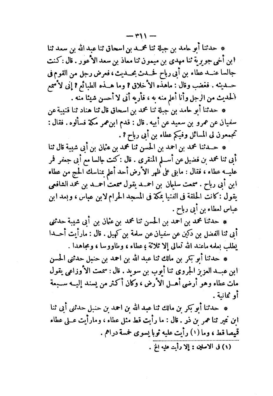 حَدَّثَنَا أَبُو بَكْرِ بْنُ مَالِكٍ، ثنا عَبْدُ اللهِ بْنُ أَحْمَدَ بْنِ حَنْبَلٍ، حَدَّثَنِي أَبِي، ثنا ابْنُ نُمَيْرٍ، ثنا عُمَرُ بْنُ ذَرٍّ، قَالَ: «§مَا رَأَيْتُ قَطُّ مِثْلَ عَطَاءٍ، وَمَا رَأَيْتُ عَلَى عَطَاءٍ قَمِيصًا قَطُّ، وَمَا رَأَيْتُ عَلَيْهِ ثَوْبًا يُسْوَى خَمْسَةَ دَرَاهِمَ»