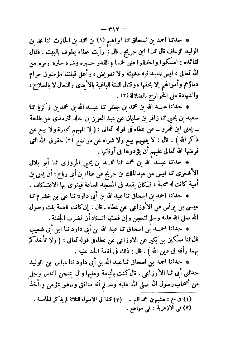 حَدَّثَنَا أَحْمَدُ بْنُ إِسْحَاقَ، ثنا إِبْرَاهِيمُ بْنُ مُحَمَّدِ بْنِ الْحَارِثِ، ثنا مُحَمَّدُ بْنُ الْوَلِيدِ الزَّحَّافُ، قَالَ: ثنا ابْنُ جُرَيْجٍ، قَالَ: " رَأَيْتُ عَطَاءً يَطُوفُ بِالْبَيْتِ، فَقَالَ لِقَائِدِهِ: §أَمْسِكُوا وَاحْفَظُوا عَنِّي خَمْسًا: الْقَدْرُ خَيْرُهُ وَشَرُّهُ حُلُّوهُ وَمُرُّهُ مِنَ اللهِ تَعَالَى لَيْسَ لِلْعَبْدِ فِيهِ مَشِيئَةٌ وَلَا تَفْوِيضٌ، وَأَهْلُ قِبْلَتِنَا مُؤْمِنُونَ حَرَامٌ دِمَاؤُهُمْ وَأَمْوَالُهُمْ إِلَّا بِحَقِّهَا، وَقِتَالُ الْفِئَةِ الْبَاغِيَةِ بِالْأَيْدِي وَالنِّعَالِ لَا بِالسِّلَاحِ، وَالشَّهَادَةُ عَلَى الْخَوَارِجِ بِالضَّلَالَةِ "