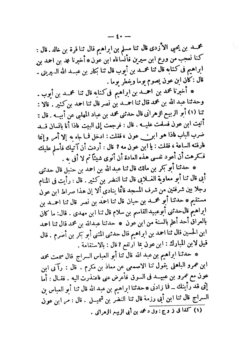 حَدَّثَنَا إِبْرَاهِيمُ بْنُ عَبْدِ اللهِ، قَالَ: ثَنَا أَبُو الْعَبَّاسِ بْنُ السَّرَّاجِ، قَالَ: ثَنَا ابْنُ أَبِي رِزْمَةَ، قَالَ: ثَنَا النَّضْرُ بْنُ شُمَيْلٍ، قَالَ: " مَرَّ ابْنُ عَوْنٍ -[41]- بِرَجُلٍ مِنْ قُرَيْشٍ وَهُوَ جَالِسٌ مَعَ عَمْرِو بْنِ عُبَيْدٍ فَقَالَ: §السَّلَامُ عَلَيْكَ، مَا تَصْنَعُ هَهُنَا؟ "
