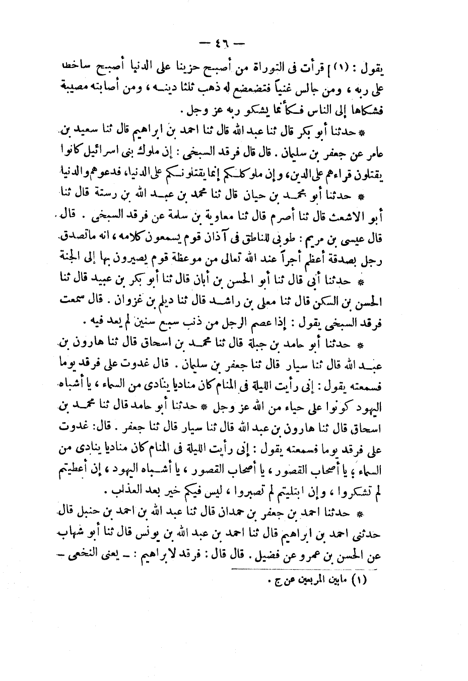 حَدَّثَنَا أَبُو حَامِدٍ، قَالَ: ثَنَا مُحَمَّدُ بْنُ إِسْحَاقَ، قَالَ: ثَنَا هَارُونُ بْنُ عَبْدِ اللهِ، قَالَ: ثَنَا سَيَّارٌ، قَالَ: ثَنَا جَعْفَرٌ، قَالَ: " غَدَوْتُ عَلَى فَرْقَدٍ يوْمًا فَسَمِعْتُهُ يَقُولُ: §إِنِّي رَأَيْتُ اللَّيْلَةَ فِي الْمَنَامِ كَأَنَّ مُنَادِيًا يُنَادِي مِنَ السَّمَاءِ: يَا أَصْحَابَ الْقُصُورِ يَا أَصْحَابَ الْقُصُورِ يَا أَشْبَاهَ الْيهُودِ إِنْ أُعْطِيتُمْ لَمْ تَشْكُرُوا، وَإِنِ ابْتُلِيتُمْ لَمْ تَصْبِرُوا، لَيْسَ فِيكُمْ خَيْرٌ بَعْدَ الْعَذَابِ "