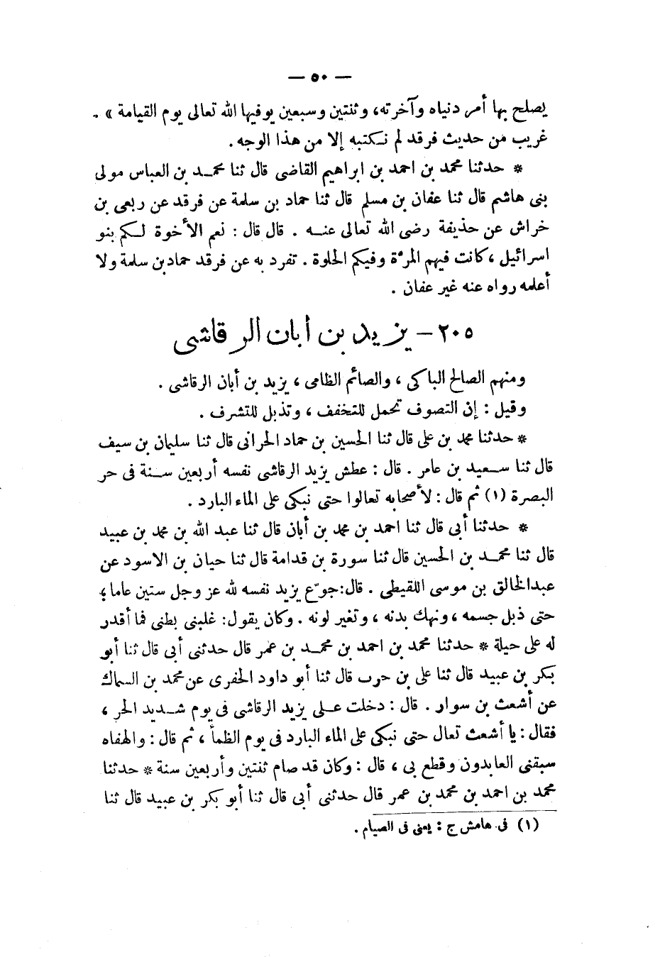 حَدَّثَنَا مُحَمَّدُ بْنُ أَحْمَدَ بْنِ مُحَمَّدِ بْنِ عُمَرَ، قَالَ: حَدَّثَنِي أَبِي قَالَ: ثَنَا أَبُو بَكْرِ بْنُ عُبَيْدٍ، قَالَ: ثَنَا عَلِيُّ بْنُ حَرْبٍ، قَالَ: ثَنَا أَبُو دَاوُدَ الْحَفَرِيُّ، عَنْ مُحَمَّدِ بْنِ السَّمَّاكِ، عَنْ أَشْعَثَ بْنِ سَوَّارٍ، قَالَ: " دَخَلْتُ عَلَى يَزِيدَ الرَّقَاشِيِّ فِي يَوْمٍ شَدِيدِ الْحَرِّ فَقَالَ: يَا أَشْعَثُ تَعَالَ حَتَّى نَبْكِيَ عَلَى الْمَاءِ الْبَارِدِ فِي يَوْمِ الظَّمَأِ، ثُمَّ قَالَ: §والحفاه سَبَقَنِي الْعَابِدُونَ، وَقُطِعَ بِي، قَالَ: وَكَانَ قَدْ صَامَ ثِنْتَيْنِ وَأَرْبَعِينَ سَنَةً "