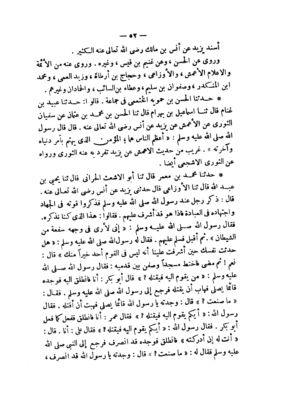 حَدَّثَنَا مُحَمَّدُ بْنُ مَعْمَرٍ، قَالَ: ثَنَا أَبُو الْأَشْعَثِ الْحَرَّانِيُّ، قَالَ: ثَنَا يَحْيَى بْنُ عَبْدِ اللهِ، قَالَ: ثَنَا الْأَوْزَاعِيُّ، قَالَ: حَدَّثَنِي يَزِيدُ، عَنْ أَنَسٍ، رَضِيَ اللهُ تَعَالَى عَنْهُ قَالَ: " ذُكِرَ رَجُلٌ عِنْدَ رَسُولِ اللهِ صَلَّى اللهُ عَلَيْهِ وَسَلَّمَ، فَذَكَرُوا قُوَّتَهُ فِي الْجِهَادِ وَاجْتِهَادَهُ فِي الْعِبَادَةِ، فَإِذَا هُوَ قَدْ أَشْرَفَ عَلَيْهِمْ، فَقَالُوا: هَذَا الَّذِي كُنَّا نَذْكُرُهُ. فَقَالَ رَسُولُ اللهِ صَلَّى اللهُ عَلَيْهِ وَسَلَّمَ: «§إِنِّي لَأَرَى وَجْهَهُ سَفْعَةً مِنَ الشَّيْطَانِ» ثُمَّ أَقْبَلَ فَسَلَّمَ عَلَيْهِمْ، فَقَالَ لَهُ رَسُولُ اللهِ صَلَّى اللهُ عَلَيْهِ وَسَلَّمَ: «هَلْ حَدَّثْتَ نَفْسَكَ حِينَ أَشْرَفْتَ عَلَيْنَا أَنَّهُ لَيْسَ فِي الْقَوْمِ أَحَدٌ خَيْرًا مِنْكَ؟» قَالَ: نَعَمْ، ثُمَّ مَضَى فَاخْتَطَّ مَسْجِدًا وَصَفَنَ بَيْنَ قَدَمَيْهِ: فَقَالَ رَسُولُ اللهِ صَلَّى اللهُ عَلَيْهِ وَسَلَّمَ: «مَنْ يَقُومُ إِلَيْهِ فَيَقْتُلُهُ» قَالَ أَبُو بَكْرٍ: أَنَا فَانْطَلَقَ إِلَيْهِ فَوَجَدَهُ قَائِمًا يُصَلِّي فَهَابَ أَنْ يقْتُلَهُ فَرَجَعَ إِلَى رَسُولِ اللهِ صَلَّى اللهُ عَلَيْهِ وَسَلَّمَ فَقَالَ: «مَا صَنَعْتَ؟» قَالَ: وَجَدْتُهُ يَا رَسُولَ اللهِ قَائِمًا يُصَلِّي فَهِبْتُ أَنْ أَقْتُلَهُ. فَقَالَ رَسُولُ اللهِ: «أَيُّكُمْ يَقُومُ إِلَيْهِ فَيَقْتُلُهُ» فَقَالَ عُمَرُ: أَنَا، فَانْطَلَقَ فَفَعَلَ كَمَا فَعَلَ أَبُو بَكْرٍ فَقَالَ رَسُولُ اللهِ: «أًيُّكُمْ يَقُومُ إِلَيْهِ فَيَقْتُلُهُ»؟ فَقَالَ عَلِيٌّ: أَنَا، قَالَ: «أَنْتَ لَهُ إِنْ أَدْرَكْتَهُ» فَانْطَلَقَ فَوَجَدَهُ قَدِ انْصَرَفَ، فَرَجَعَ إِلَى النَّبِيِّ صَلَّى اللهُ عَلَيْهِ وَسَلَّمَ فَقَالَ لَهُ: «مَا صَنَعْتَ؟» قَالَ: وَجَدْتُهُ يَا رَسُولَ اللهِ قَدِ انْصَرَفَ، -[53]- فَقَالَ رَسُولُ اللهِ صَلَّى اللهُ عَلَيْهِ وَسَلَّمَ: «هَذَا أَوَّلُ مَنْ يَخْرُجُ مِنْ أُمَّتِي لَوْ قَتَلْتَهُ مَا اخْتَلَفَ اثْنَانِ بَعْدَهُ مِنْ أُمَّتِي» ثُمَّ قَالَ: «إِنَّ بَنِي إِسْرَائِيلَ تَفَرَّقَتْ عَلَى إِحْدَى وَسَبْعِينَ فِرْقَةً، وَإِنَّ أُمَّتِي سَتَفْتَرِقُ عَلَى ثِنْتَيْنِ وَسَبْعِينَ فِرْقَةً، كُلُّهَا فِي النَّارِ إِلَّا وَاحِدَةً» قَالَ يَزِيدُ: وَهِيَ الْجَمَاعَةُ. رَوَاهُ عِكْرِمَةُ بْنُ عَمَّارٍ وَغَيْرُهُ، عَنْ يَزِيدَ نَحْوَهُ