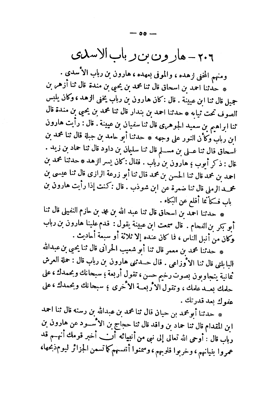 حَدَّثَنَا أَحْمَدُ بْنُ إِسْحَاقَ، قَالَ: ثَنَا عَبْدُ اللهِ بْنُ مُحَمَّدِ بْنِ حَازِمٍ النُّفَيْلِيُّ، قَالَ: ثَنَا أَبُو بَكْرِ بْنُ الْفَحَّامِ، قَالَ: سَمِعْتُ ابْنَ عُيَيْنَةَ، يَقُولُ: «§قَدِمَ عَلَيْنَا هَارُونُ بْنُ رَبَابٍ وَكَانَ مِنْ أَنْبَلِ النَّاسِ، فَمَا كَانَ عِنْدَهُ إِلَّا ثَلَاثَةُ أَوْ سَبْعَةُ أَحَادِيثَ»