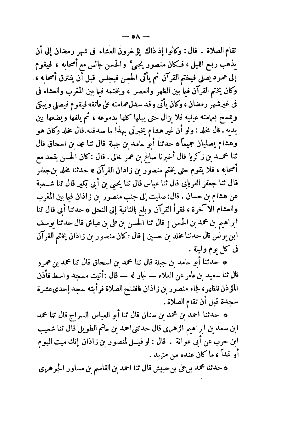 حَدَّثَنَا أَبُو حَامِدِ بْنُ جَبَلَةَ، قَالَ: ثَنَا مُحَمَّدُ بْنُ إِسْحَاقَ، قَالَ: ثَنَا مُحَمَّدُ بْنُ زَكَرِيَّا، قَالَ: أَخْبَرَنَا صَالِحُ بْنُ عُمَرَ، خَالِي قَالَ: كَانَ الْحَسَنُ يَقْعُدُ مَعَ أَصْحَابِهِ، §فَلَا يَقُومُ حَتَّى يَخْتِمَ مَنْصُورُ بْنُ زَاذَانَ الْقُرْآنَ "
