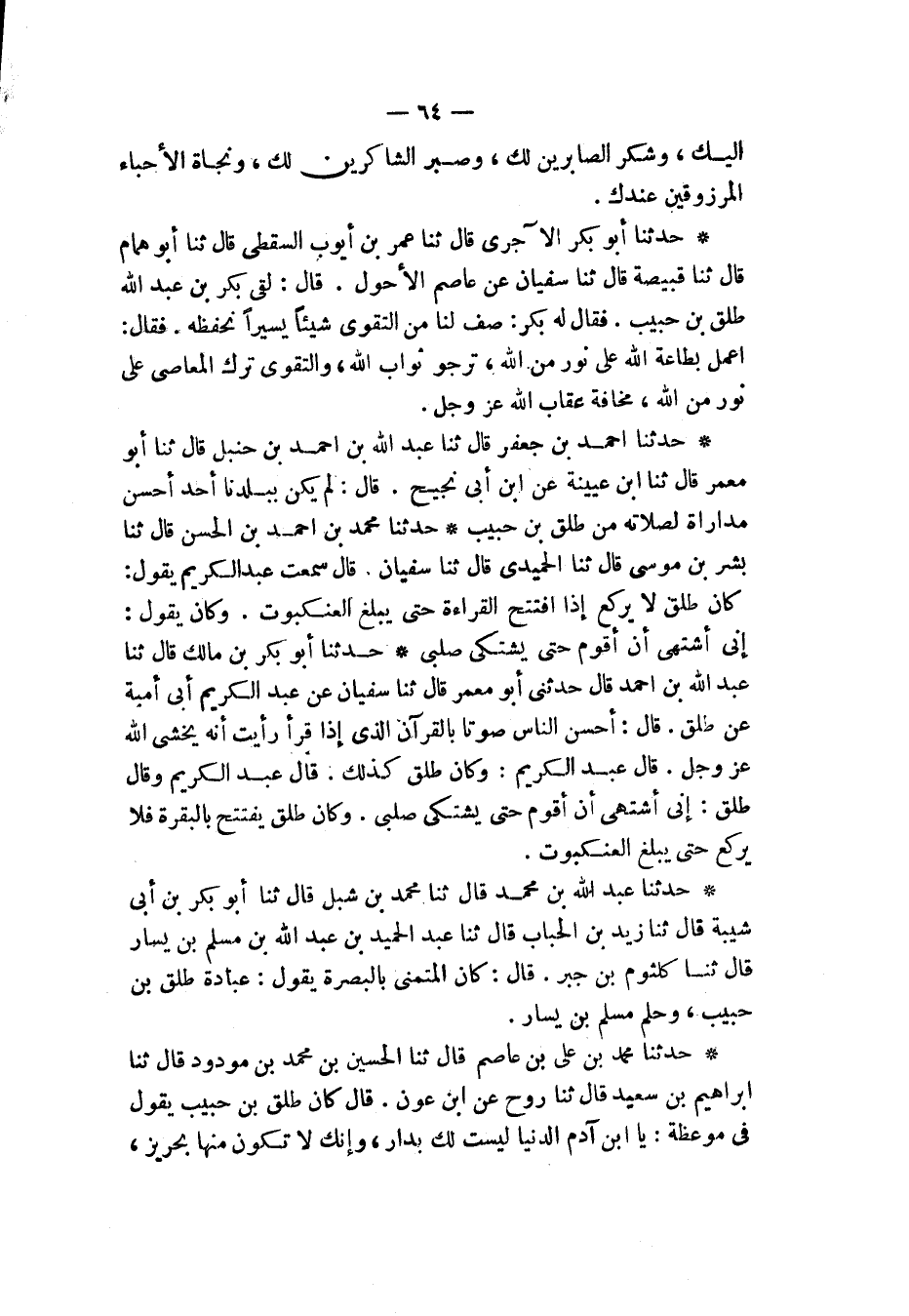 حَدَّثَنَا مُحَمَّدُ بْنُ عَلِيِّ بْنِ عَاصِمٍ، قَالَ: ثَنَا الْحُسَيْنُ بْنُ مُحَمَّدِ بْنِ مَوْدُودٍ، قَالَ: ثَنَا إِبْرَاهِيمُ بْنُ سَعِيدٍ قَالَ: ثَنَا رَوْحٌ، عَنِ ابْنِ عَوْنٍ، قَالَ: كَانَ طَلْقُ بْنُ حَبِيبٍ يَقُولُ فِي مَوْعِظَةٍ: «§يَا ابْنَ آدَمَ الدُّنْيَا لَيْسَتْ لَكَ بِدَارٍ، وَإِنَّكَ لَا تَكُونُ مِنْهَا بِحَرِيزٍ، -[65]- فَاتَّقِ اللهَ يَا ابْنَ آدَمَ فِي السِّرِّ الْمُفْضَى بِهِ إِلَيْكَ»